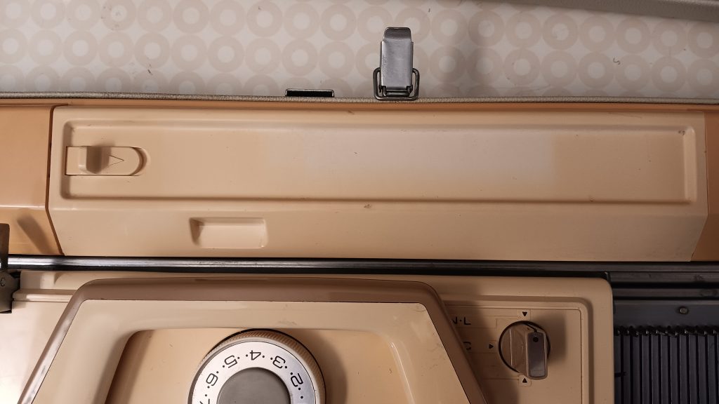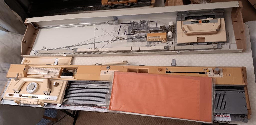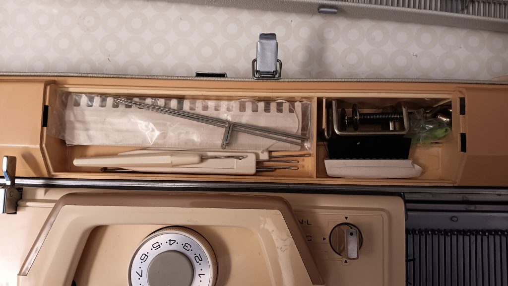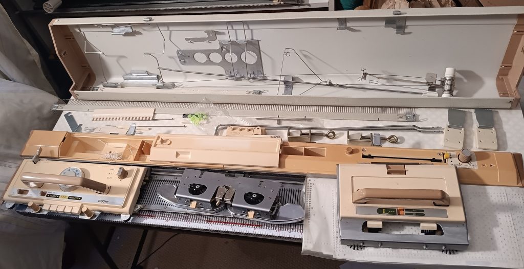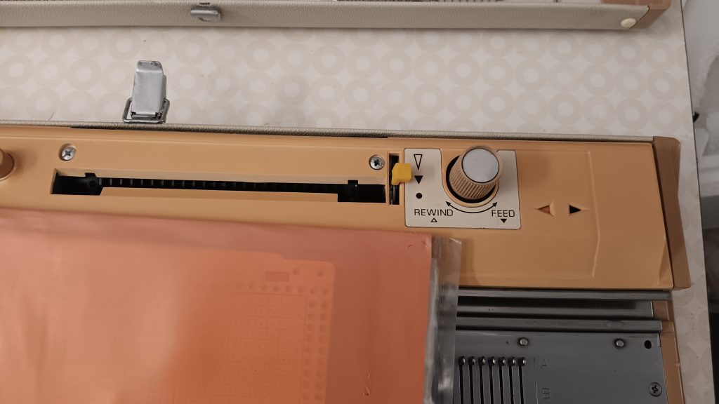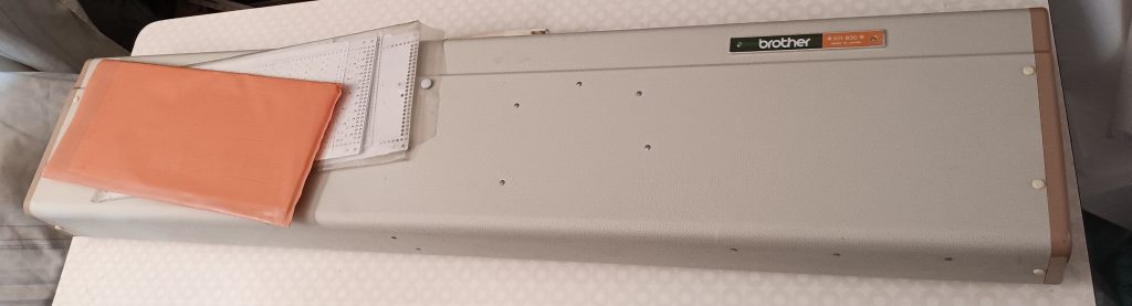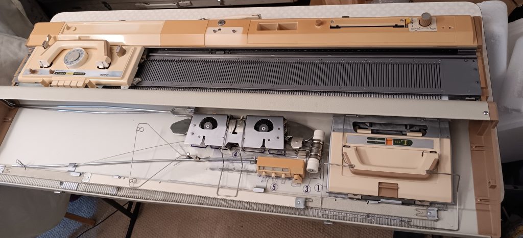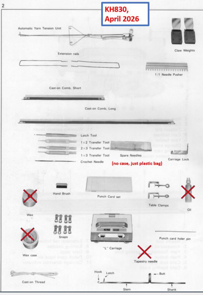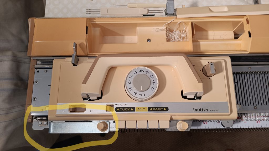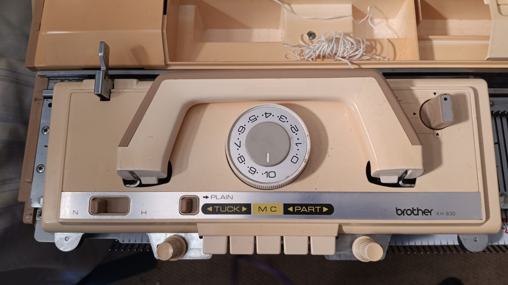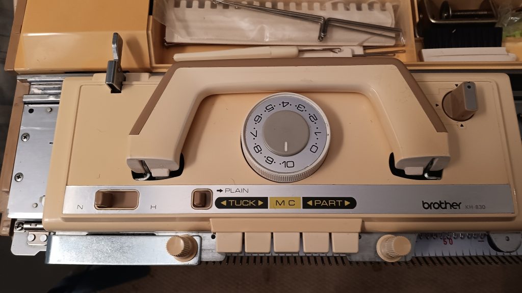 Brother KH830 is a standard-gauge knitting machine with 200 needles, 4.5 mm apart, and punchcard-reading capabilities for automatic knitting of patterned fabric. Read more about this model in my Knitting Machine Encyclopedia. The post below is dedicated to a specific machine, serviced and tested in my shop in April 2026.