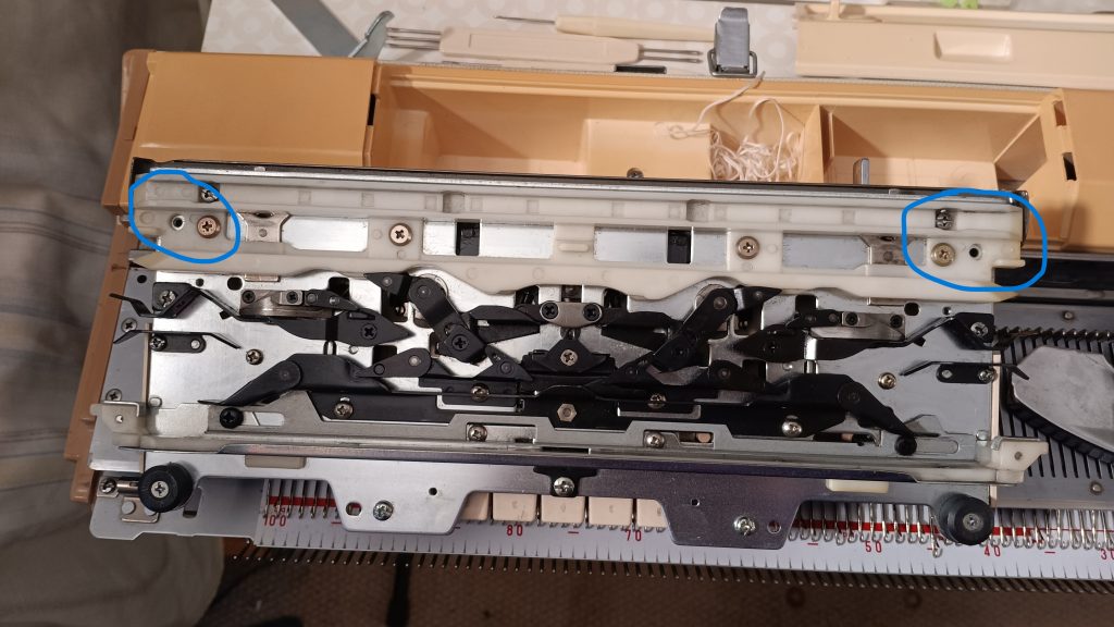 The machine did not come with its own carriage but I found another carriage for KH830. Therefore, you will see some color differences. Additionally, some people are asking me whether I forgot to include a couple of screws while assembling the carriage back (see below). No, I did not. It was designed this way. The tension dial cap is also a replacement; thus, a slight color mismatch is present there as well.