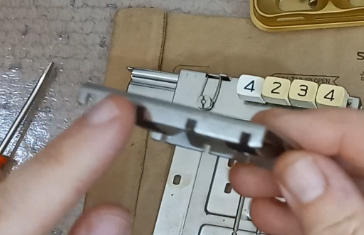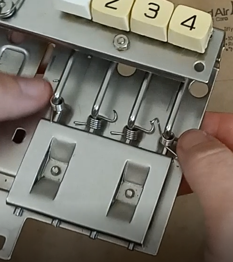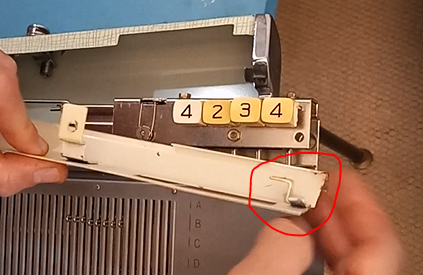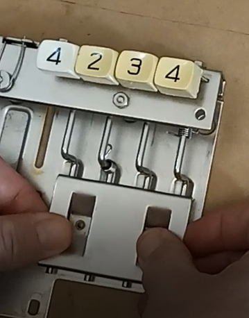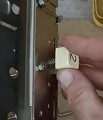 and insert the remaining screws (on the back) into the push-button assembly. Watch for the screw marked in red below. This should not be too tight otherwise the mechanism that governs the selecting strips might not move as freely. If you experience it, loosen up that screw.