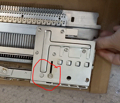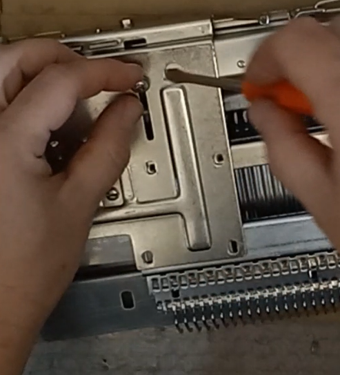 Flip the bed and remove the button-rod mechanism by unscrewing all screws on the back. The two screws marked below hold the whole mechanism together while all others simply attach the mechanism to the needle bed.