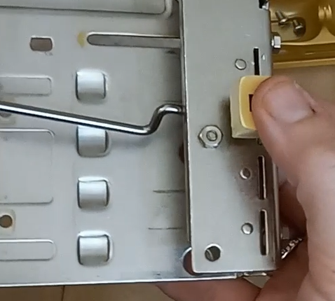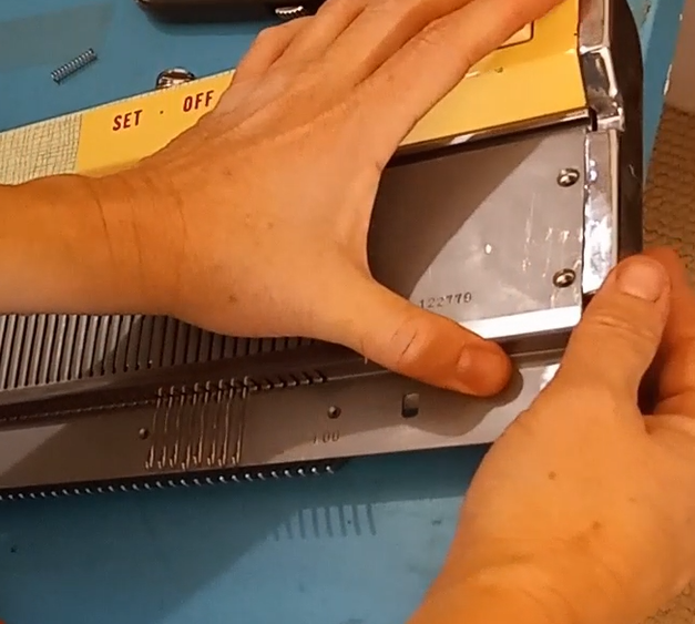The cover for the button mechanism can be easily removed: there is one screw on the right-hand side, kinda underneath …