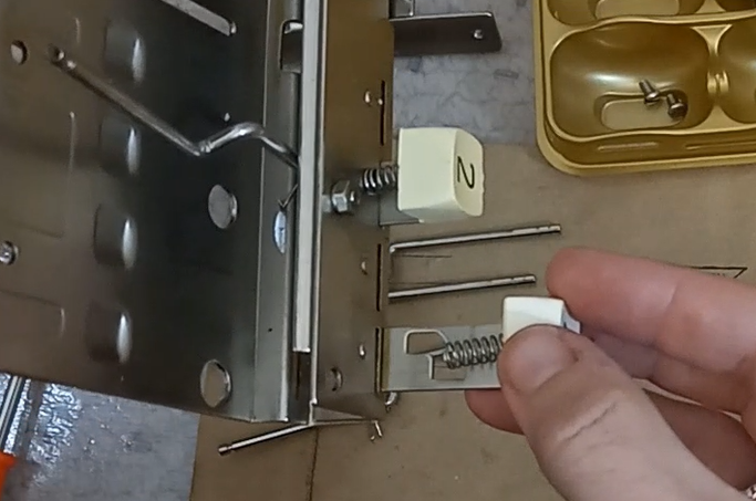 First, insert the tension spring into the pushbutton and then inside the holding plate.