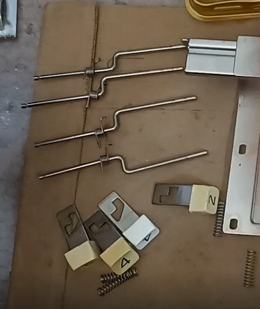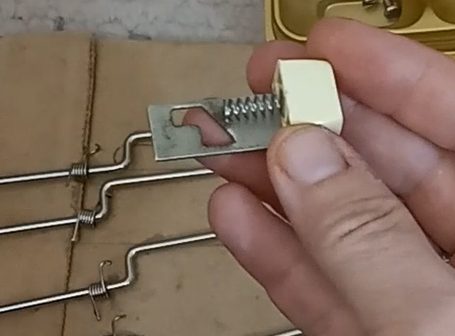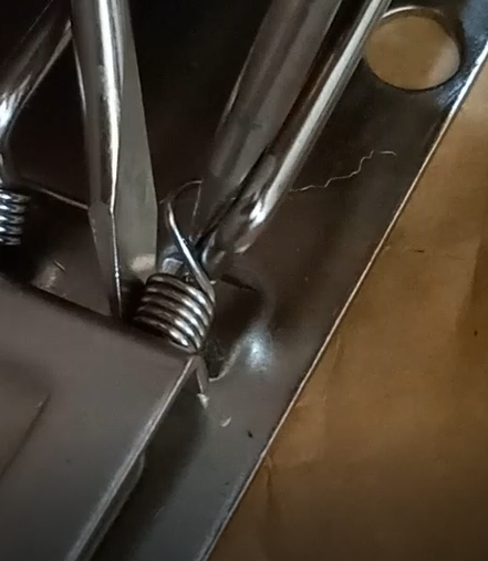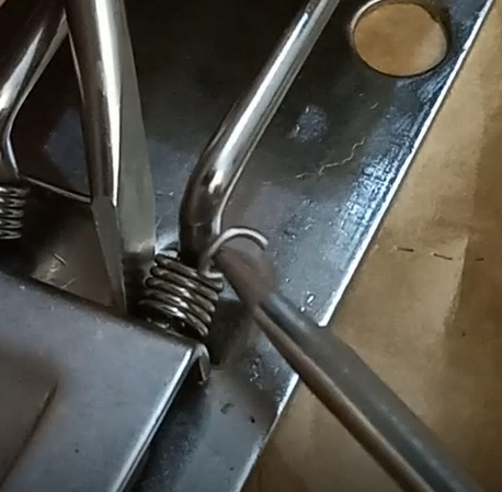 While holding (very tight) the straight end of the spring with one screwdriver, we stretch the torsion spring on the curled-end side and hook the spring on the rod. It might take you several attempts because it is hard and awkward to do. Don’t get discouraged. Repeat for the remainder of the rods/springs.