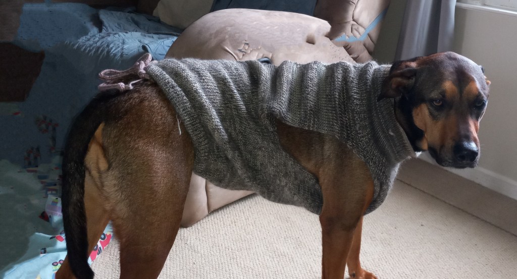 So, this time, I came up with my own pattern for a large dog sweater and I knitted it. I used the partial knitting function, HOLD position functions, mock ribbing, and cast-off. The picture below shows my (unfortunately, unhappy) model who will be wearing her new sweater. There are a couple of design flaws that I will be improving but while the next beta version is in progress, this one will keep my dog belly warm. Check out this booklet for lots of other patterns possible to make on this machine.