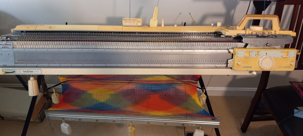 To ensure that all functions of the carriage work well, I first knitted a swatch (with a pretty thick yarn – two strands of 50 g/150 m (1.76 oz/109 yards) per skein- all went well (watch the vidhttps://youtu.be/ANFTFSCiwqseo).