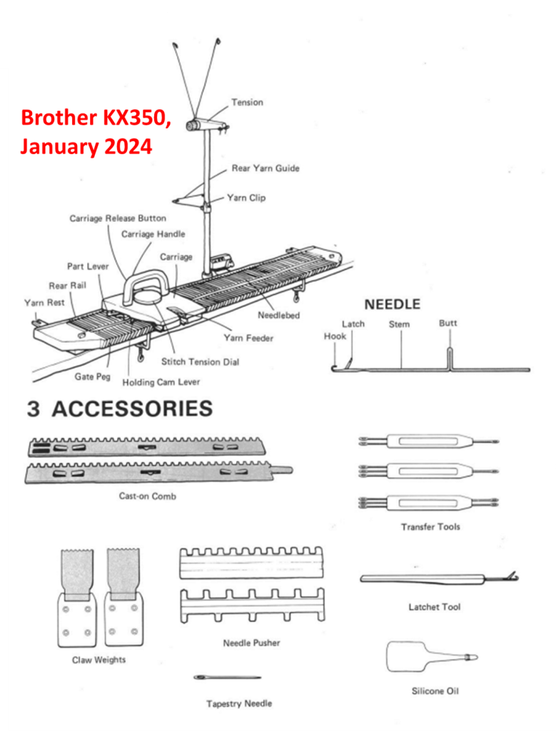 Brother KX350 knitting machine is a plastic flat needlebed machine with 130 needles, positioned 7 mm apart. The article below is dedicated to the machine I serviced and tested in January 2024. If you want to know the pros and cons of the Brother KX350 knitting machine mode, read my Knitting Machine Encyclopedia.