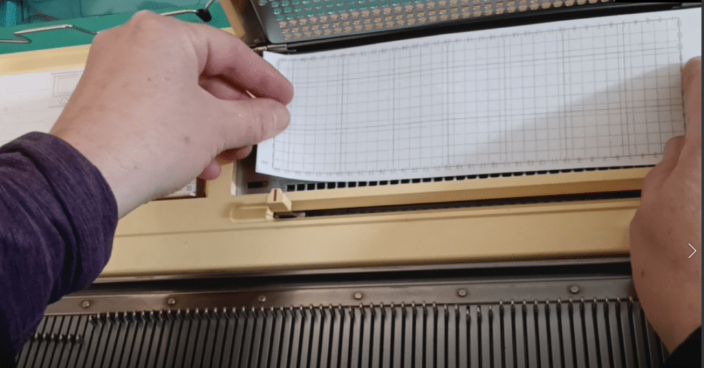Insert the cut-out punch card into the pattern card cassette holder. The manual describes all the steps of inserting the card really well. The only difference from the manual is that you will have to push the paper through the setting pins.