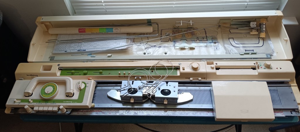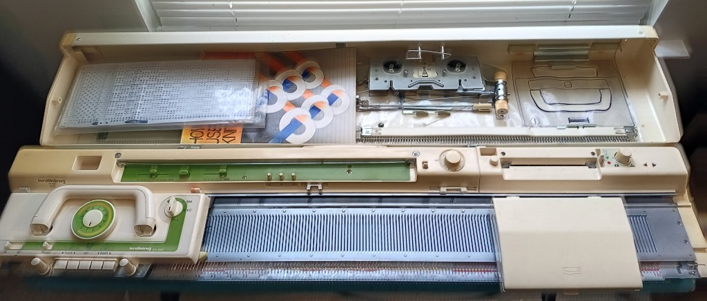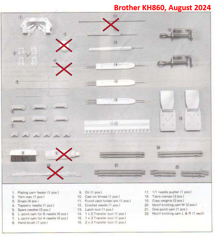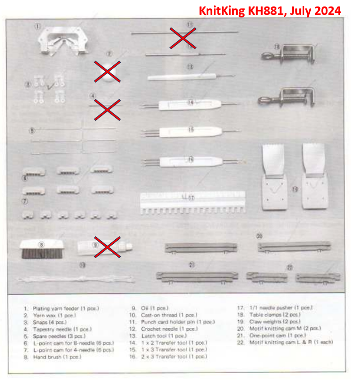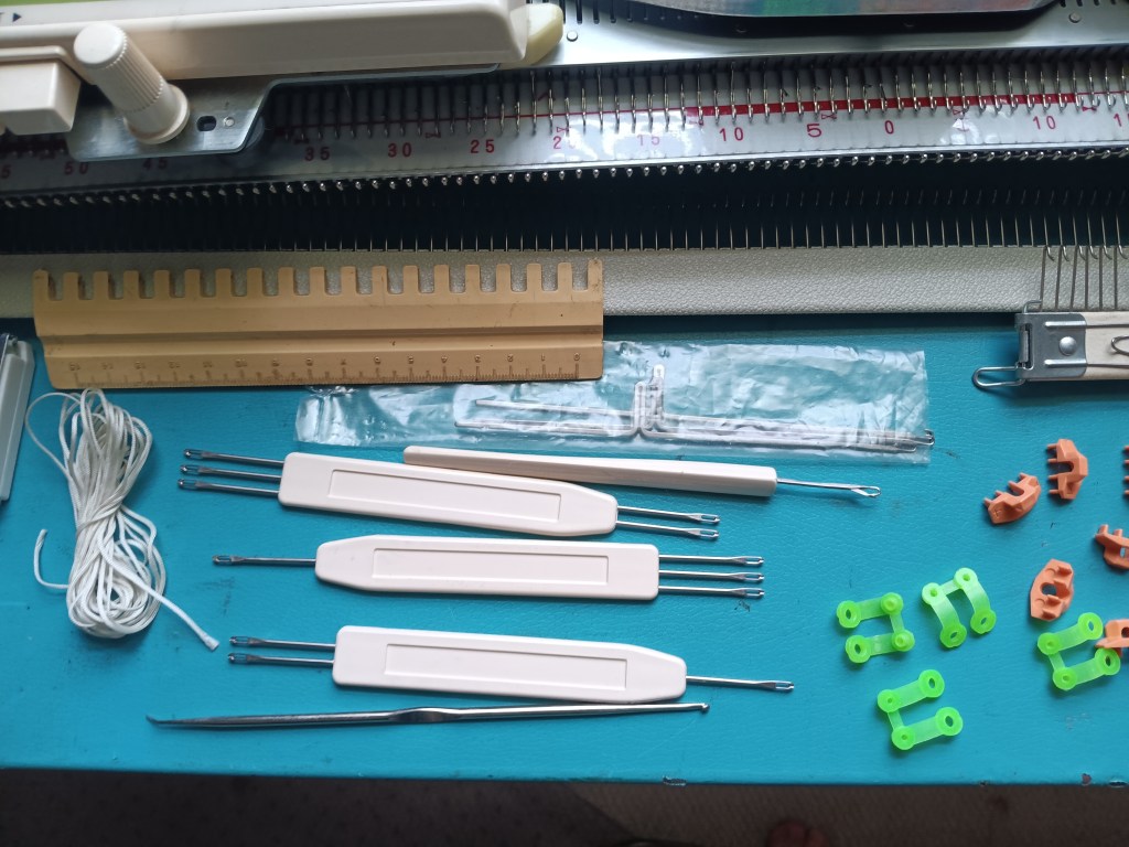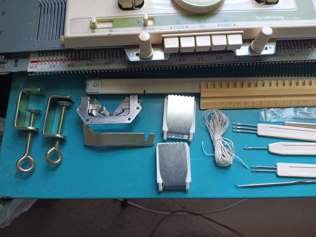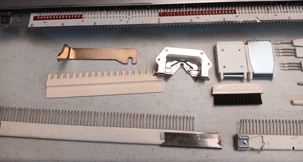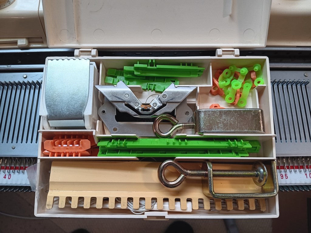 The machine came to me without the carriage and all other major accessories. I collected the major accessories from new and old stock to ensure a complete set. Thus, the knit-leader scales, sheet guides, mylar sheet, extension rails, tension mast, sinker plate, tool storage box and cast-on combs are all included.