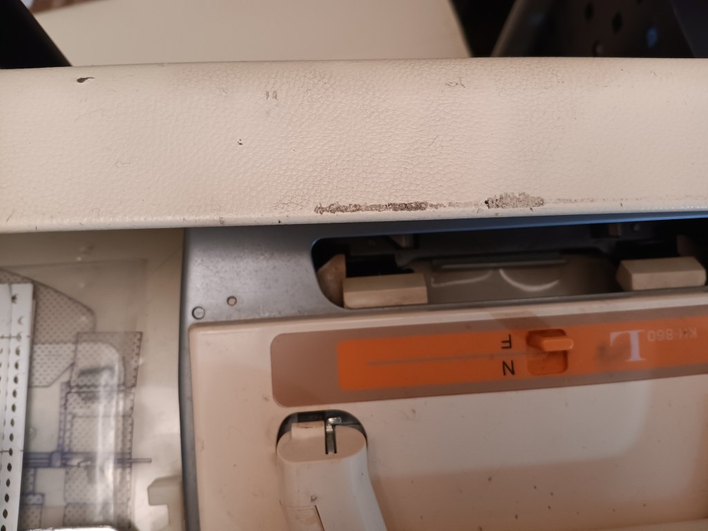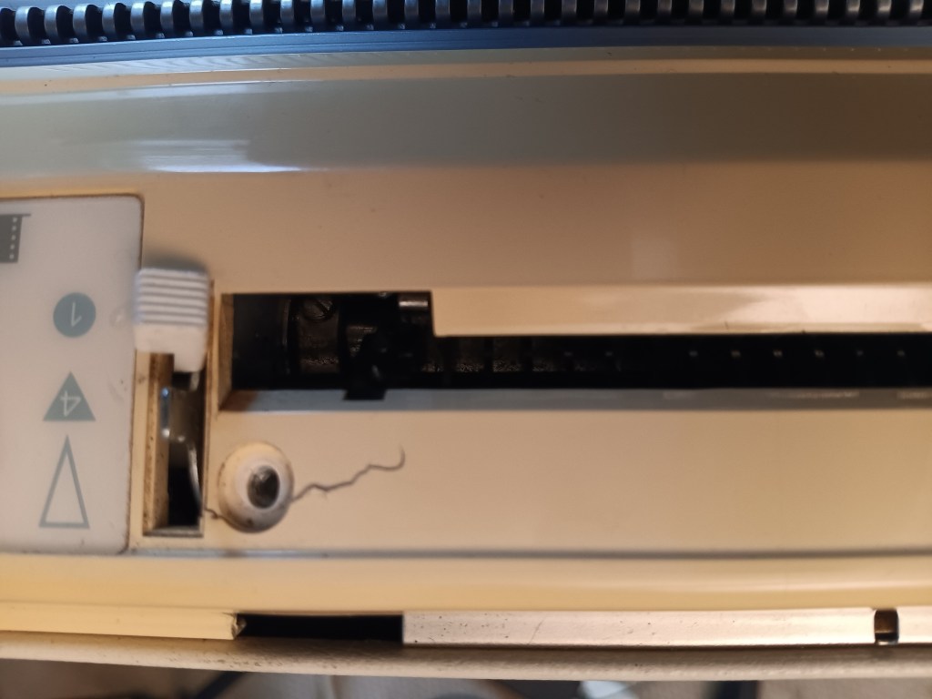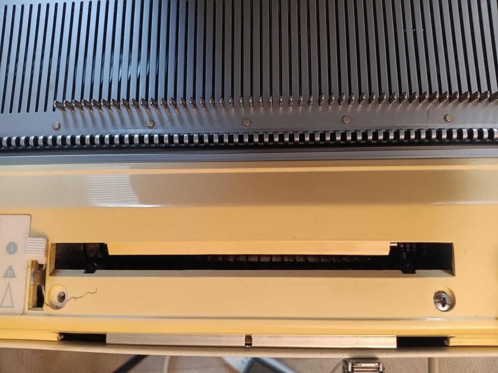 KnitKing KH881 knitting machine is a standard-gauge knitting machine with 200 needles, 4.5 mm apart. It is identical to Brother KH881. It contains a built-in knit leader. Read more about this model in my Knitting Machine Encyclopedia. The remainder of this article will be dedicated to a specific KnitKing KH881 knitting machine, serviced in my shop in July 2024.