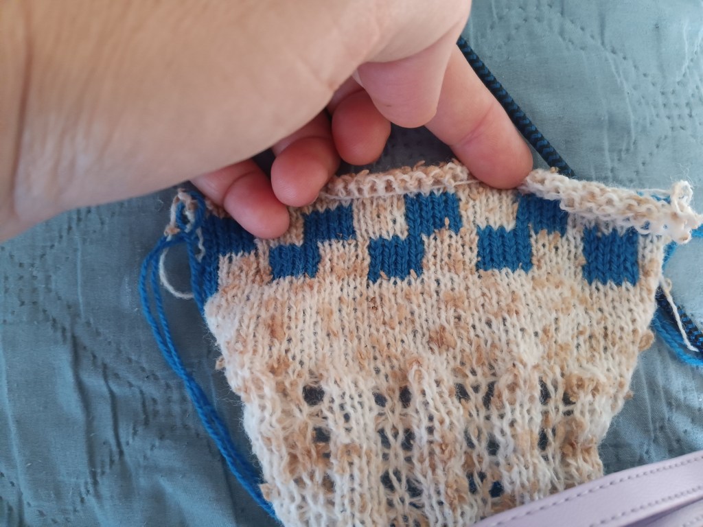 Then I knitted on the full bed to ensure that all needles form correct stitches. I knitted on all 200 needles stockinet, tuck and slip-stitch. The two-color fair isle was only done on a swatch.