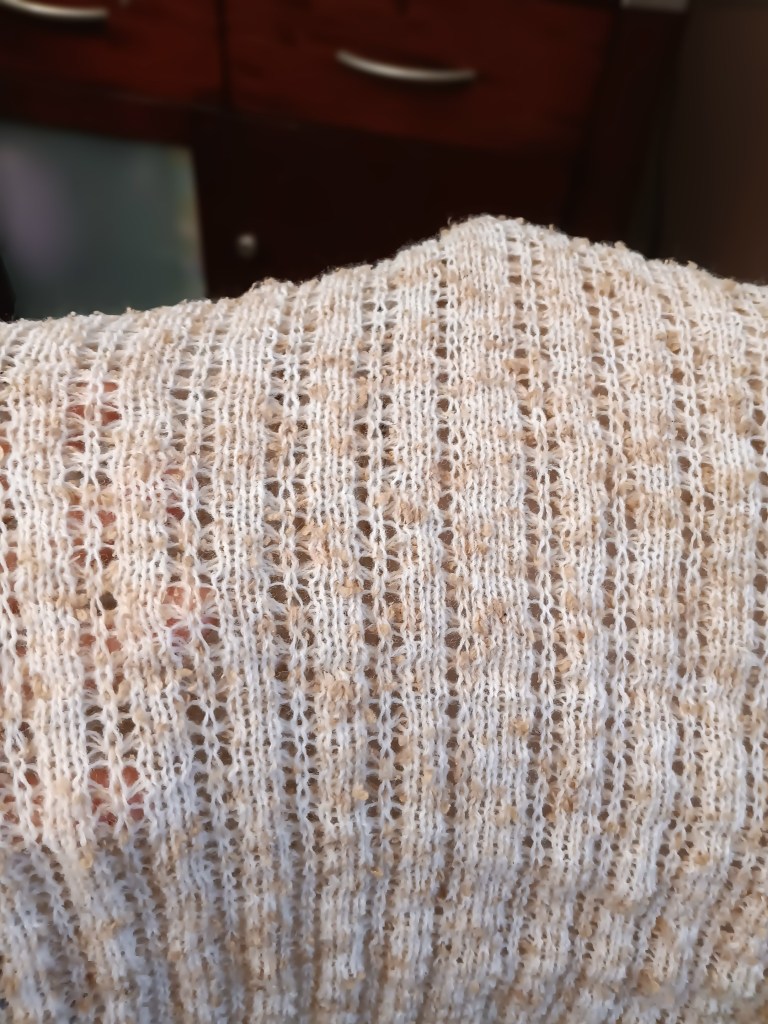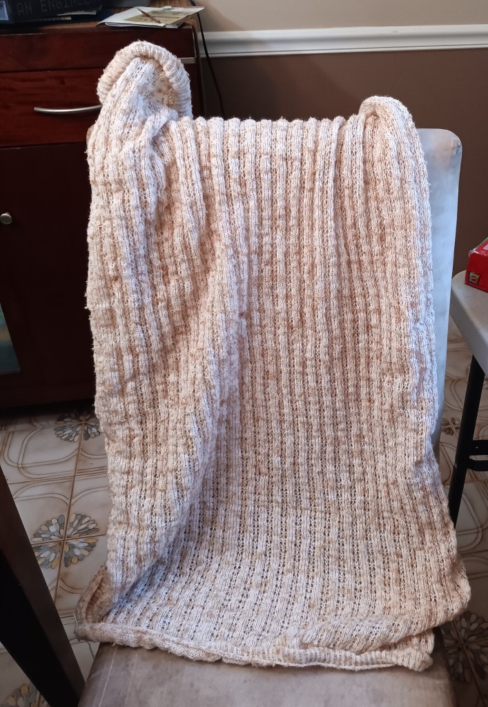I like making something from the knitted panels I knit while testing the machines. This time, I made a very light-weight but still warm baby blanket for a friend.