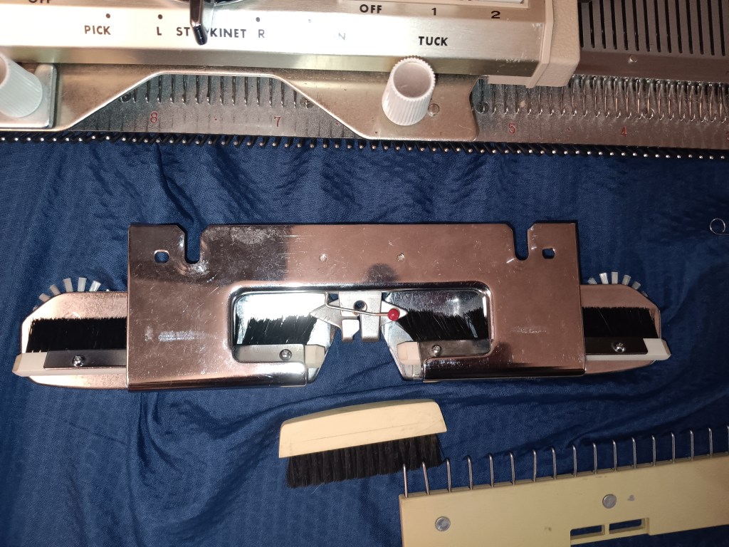 The needle bed, all needles, the patterning center and the inside of the machine were thoroughly inspected and cleaned. The carriage was thoroughly oiled to ensure all buttons, dials and levers move freely.