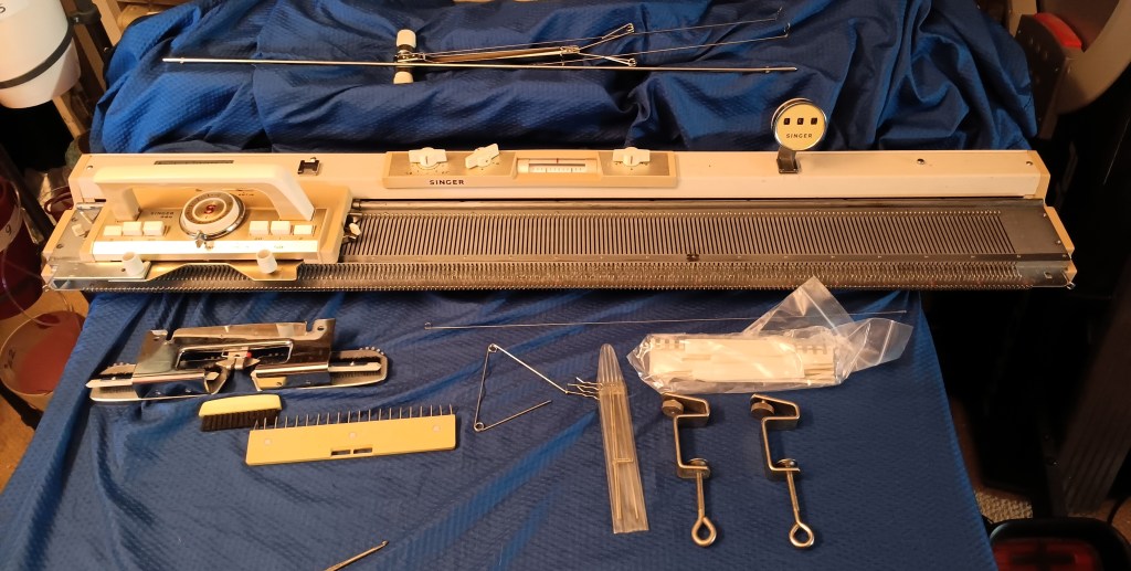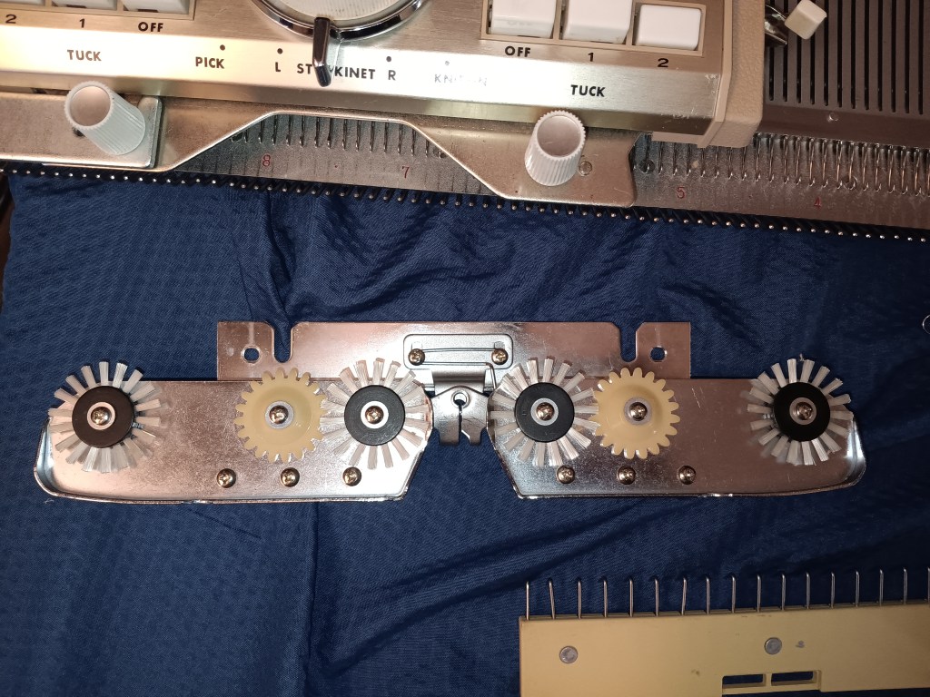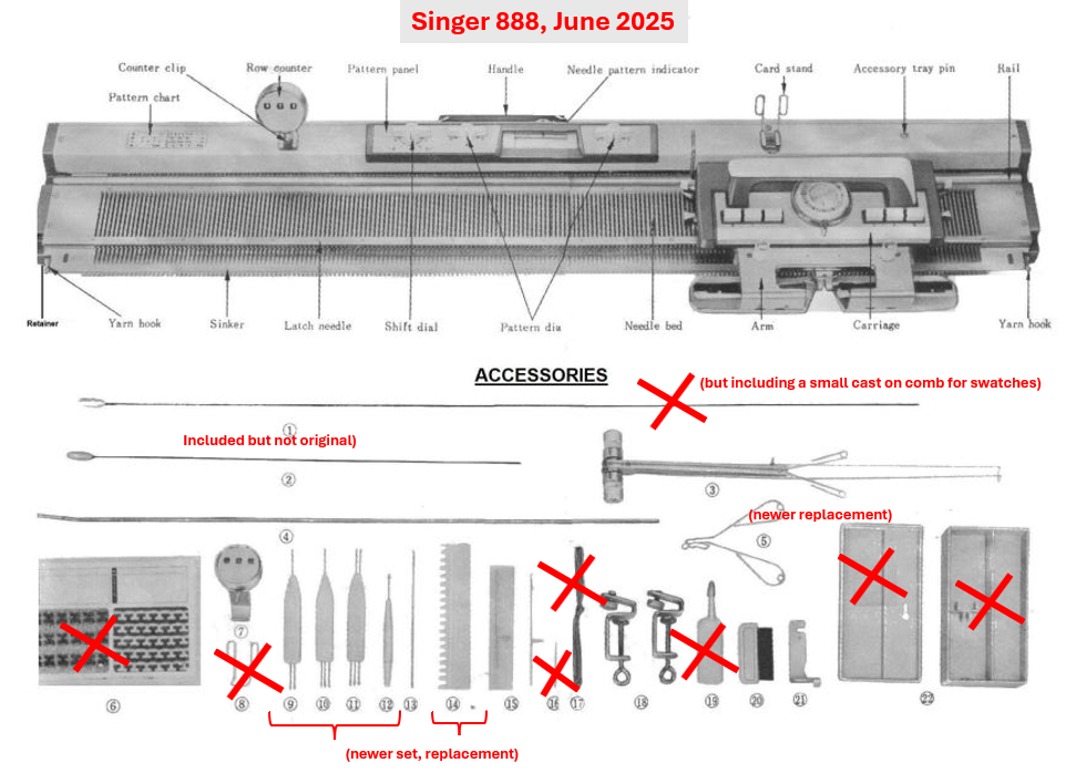 The table clamps are original. The transfer tools were missing but i am including a new set which also comes with a new needle selection ruler. Only one, 100 stitches, cast-on wire will be included. It came with the machine but does not seem to be the original (the bead on the end is not oval; a wire is simply bent into knot). As a courtesy, i am including a small cast-on comb to quickly cast on for swatches while learning the machine. I am not sure using case-on wires is a popular cast-on method since I most often see e-wrap based cast ons. Howeer, for quick swatches and quick tests, cast-on comb-based is my favorite.