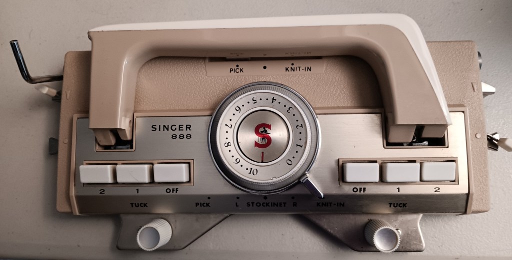 Singer 888 knitting machine model has 200 needles, 4.5 mm apart, which makes it a standard-gauge knitting machine. It was released to the market in the mid-to-late 1960s. It has turn knobs, controlling needle selection and, thus, patterning when knitting. Read more about this model in my Knitting Machine Encyclopedia. The rest of the post below is dedicated to a specific Singer 888 knitting machine, serviced and tested in my shop.