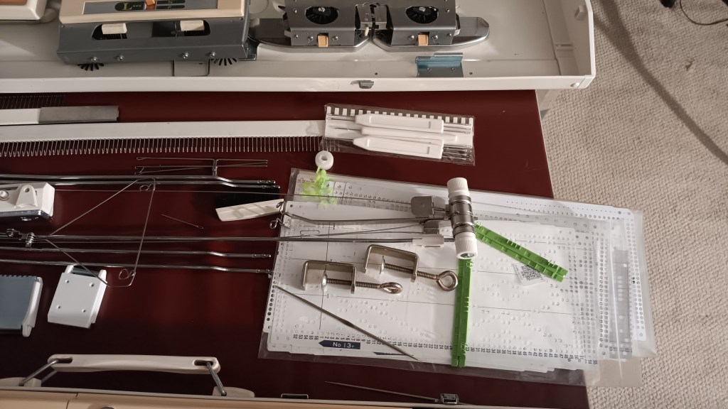 The setup will include all major and almost all minor accessories, some of which are new: tension mast, carriage lock, claw weights, table clamps, row counter, button for the punchcard mechanism and needle selection tool set. The accessories are stored in the built-in toolbox.