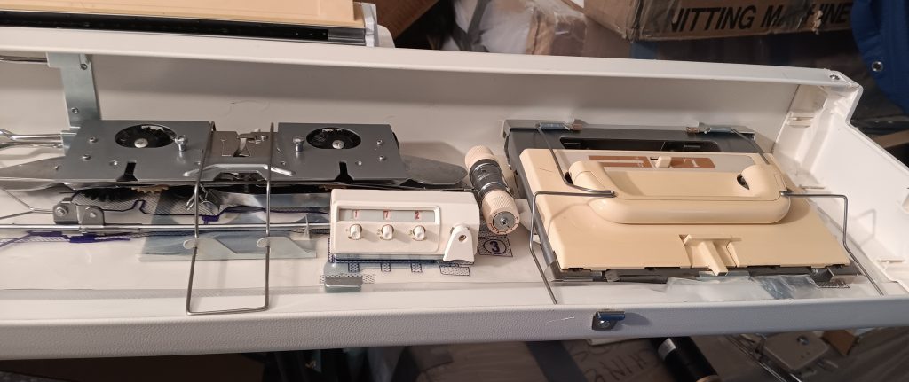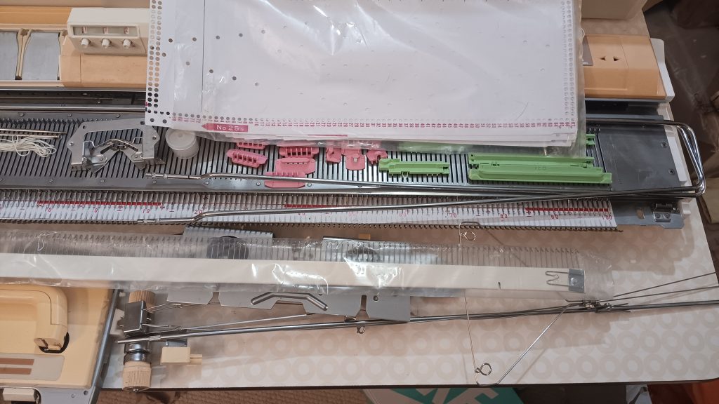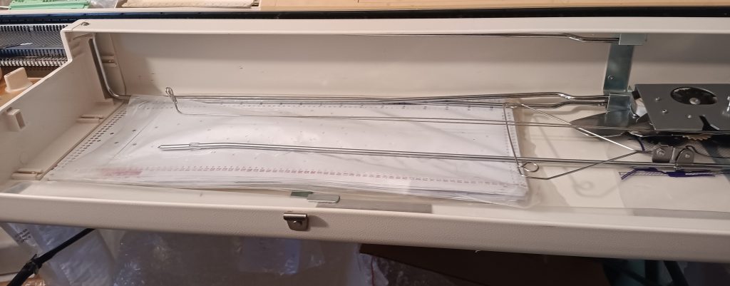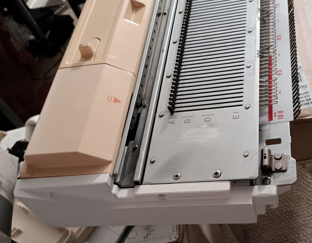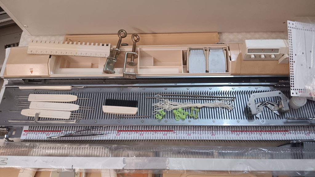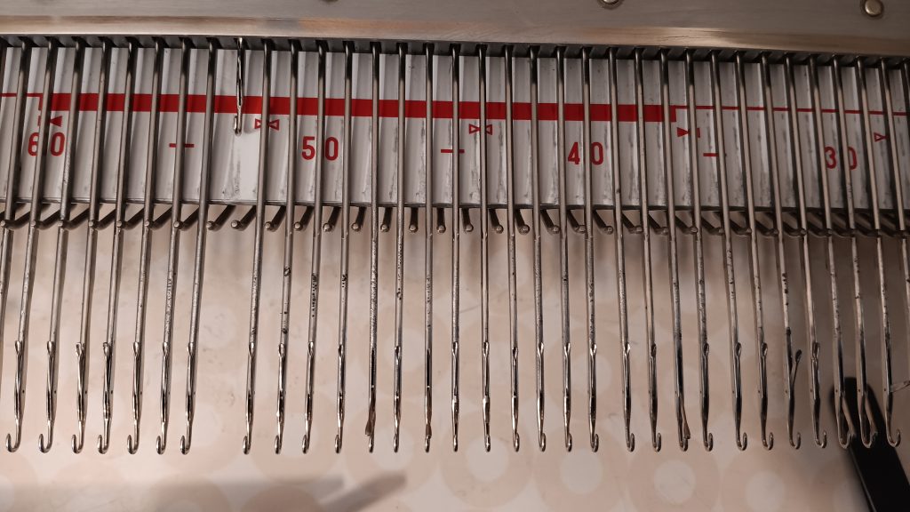 The machine was cleaned, including the deep clean of the carriage and the punchcard reader. All needles were removed, cleaned, and individually inspected. So, about 75% of the needles are the original ones, and 25% are new. After all the knitting tests, I check the needles again: first visually and if they look suspicious (out of alignment, for example), I remove them and check against new needles. The needles that were even a bit suspicious were replaced with new ones.