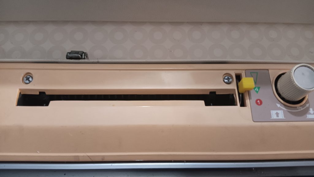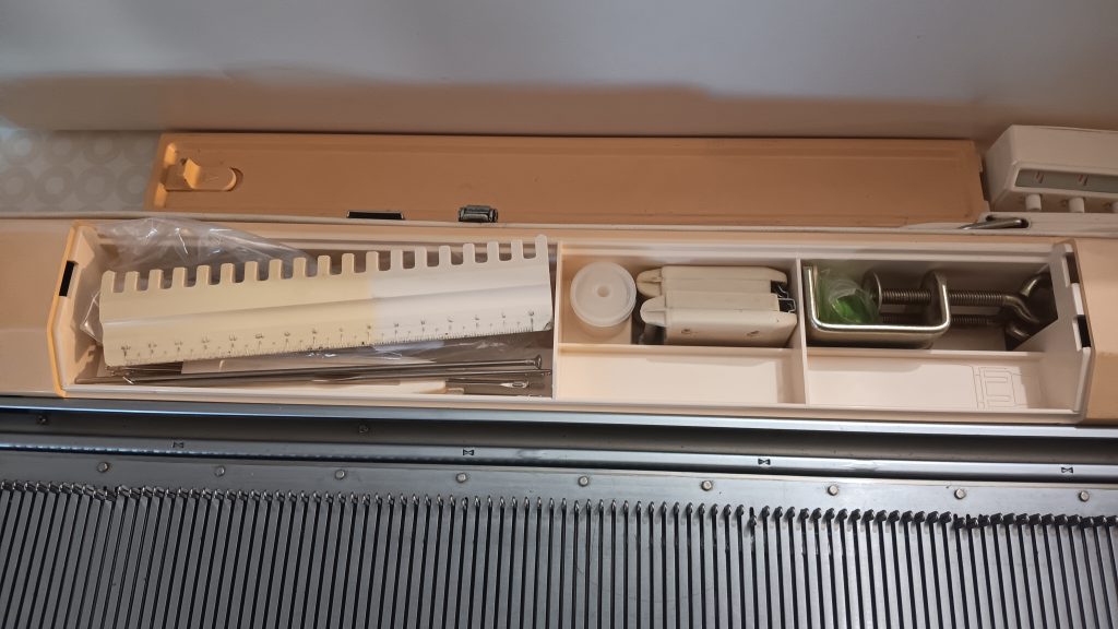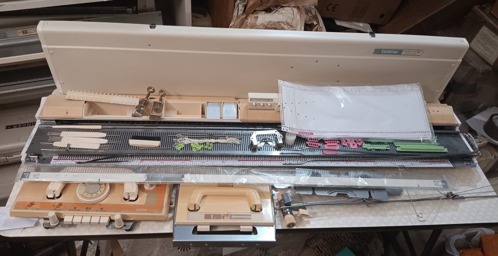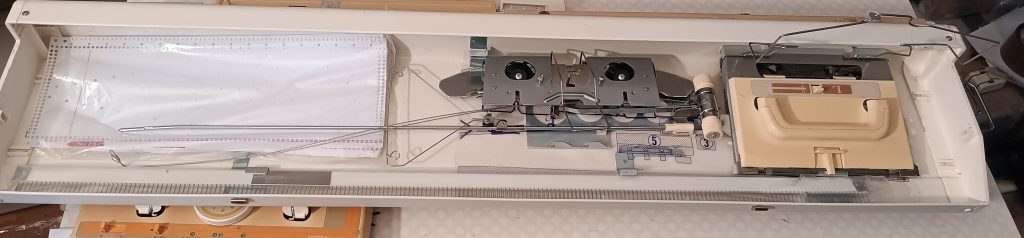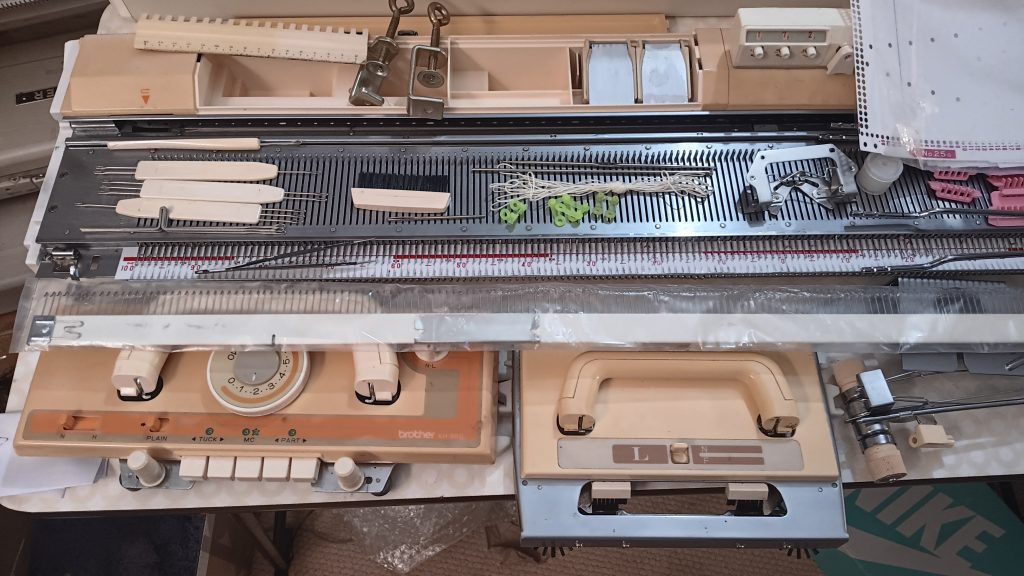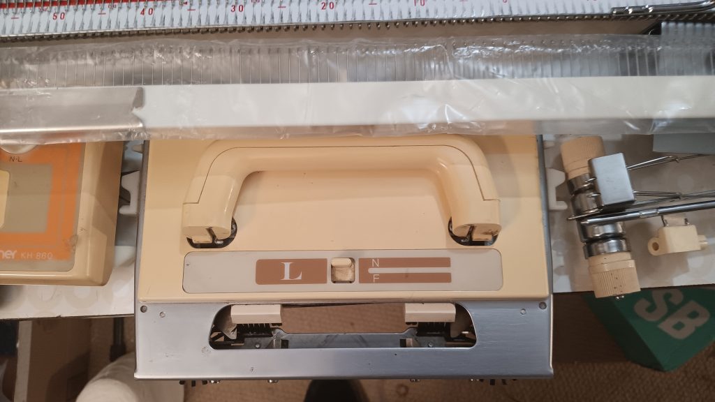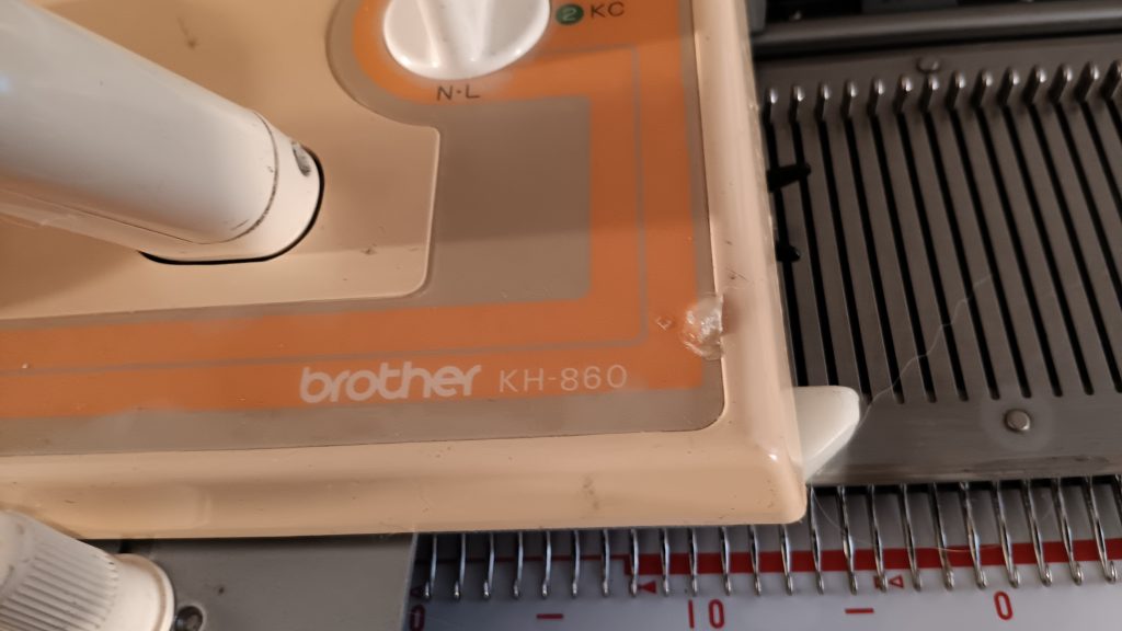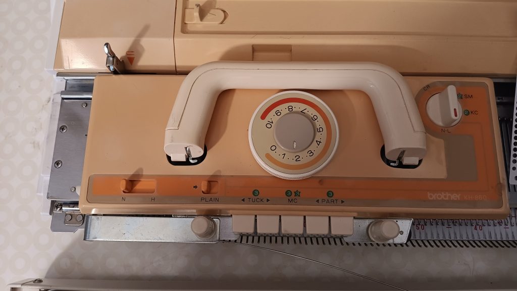 Brother KH860 is a standard-gauge knitting machine with 200 needles and a punchcard reading mechanism for automatic needle selection and patterning. Read more about this model in my Knitting Machine Encyclopedia. The article below is dedicated to a specific machine prepared in my shop in March 2026.