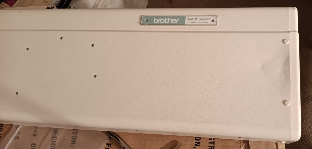 The machine did not come with the original lid case. But I found one in pretty good shape, but from Brother KH836e. Its color is whiter than the case.
