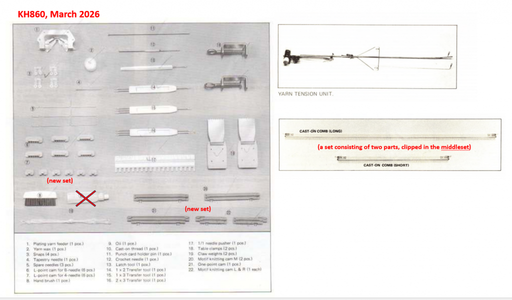 The accessories for the single motif knitting are a new replacement set. The rest of the accessories are original; thus, some discoloration on them.
