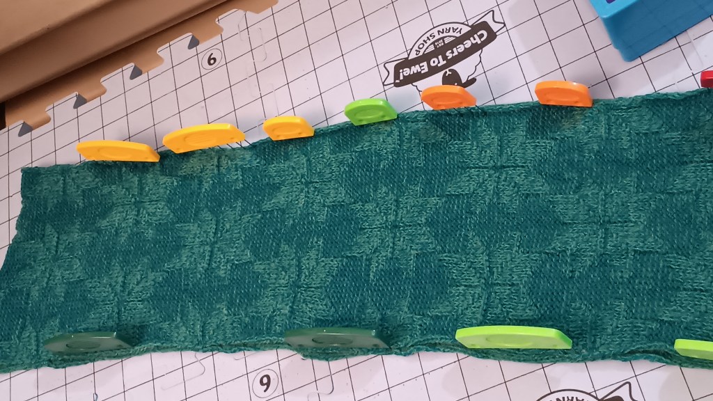 On one of the knitted panels, I saw an area with an ok-formed stitch but not super even. I was not sure what it was (probably because I mistakenly moved forward several needles on the main bed to B position, not every other one). I tested that middle section on ALL (not on every-other-one) needles. Because all the needles were selected, the carriage moved a bit harder. But all stitches formed beautifully. So: false alarm.