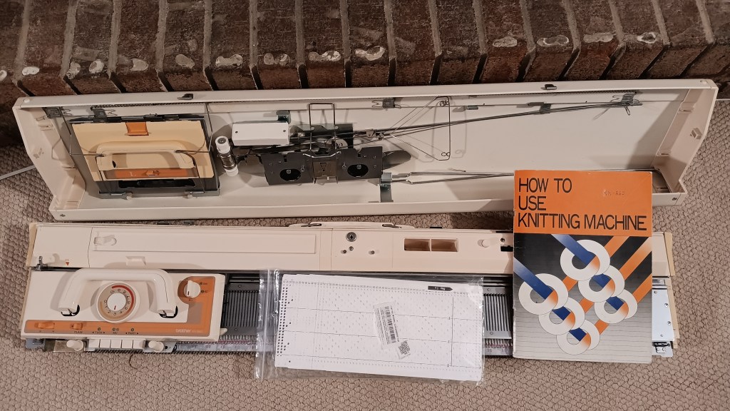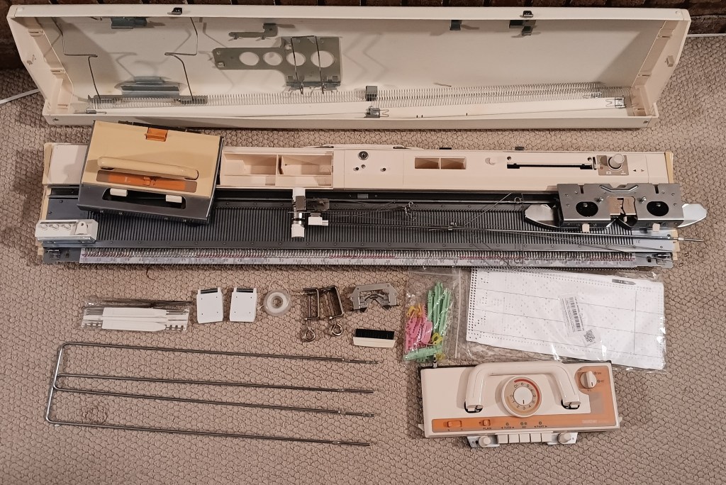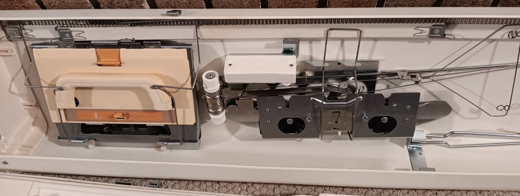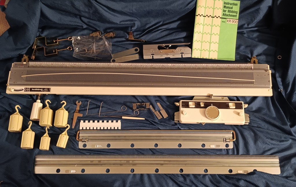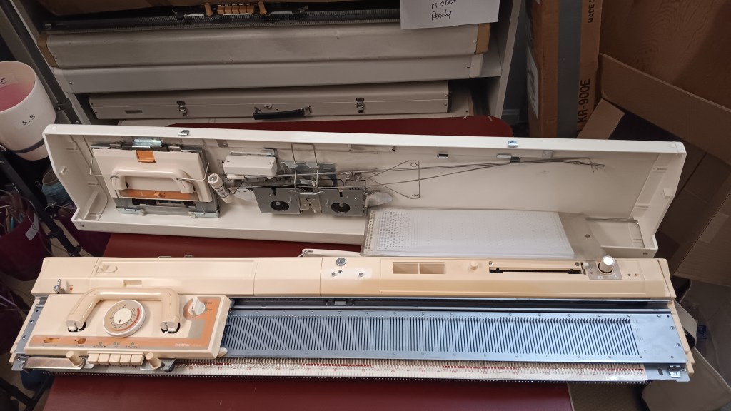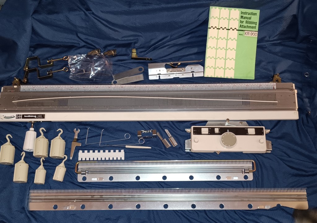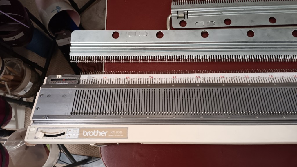 Brother KH860 knitting machine combined with Brother KR830/850 ribbing attachment is a powerful standard-gauge knitting setup capable of producing garments, blankets, and other knitted items. Read more about pros and cons of KH860, KR83,0 and KR850 in my Knitting Machine Encyclopedia. The post below is dedicated to the particular setup serviced and tested in my shop in November 2025.