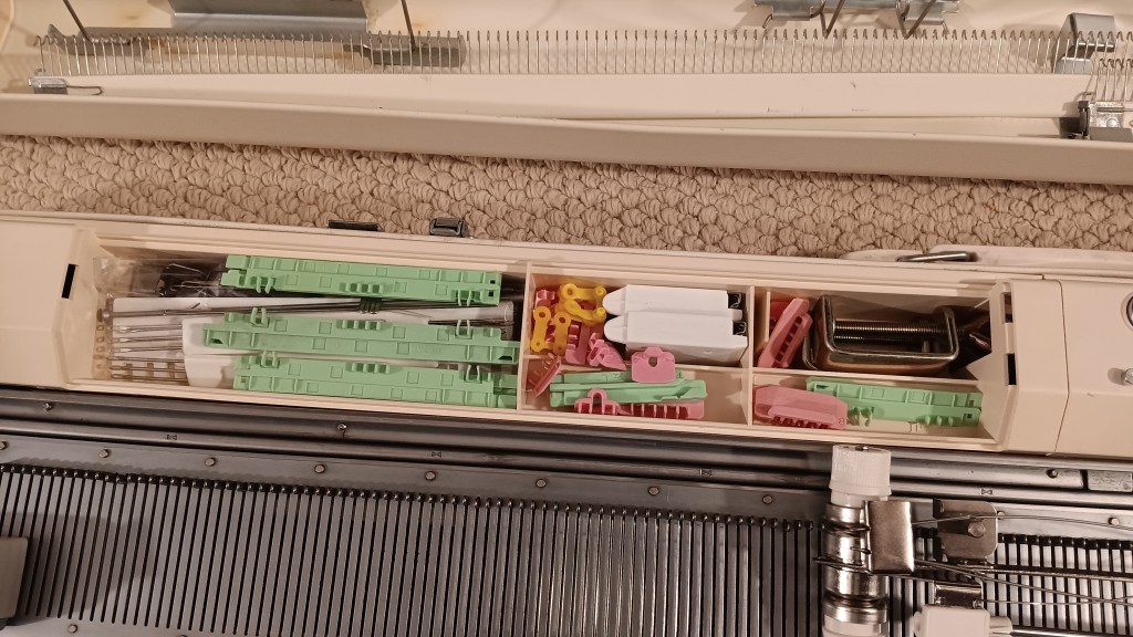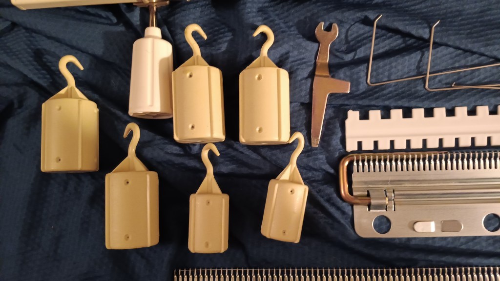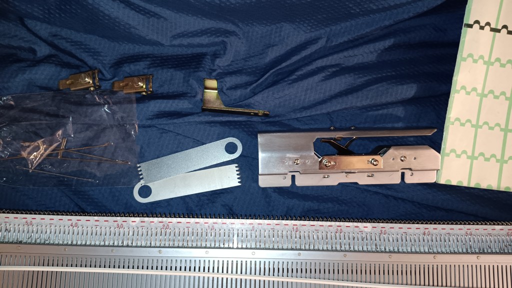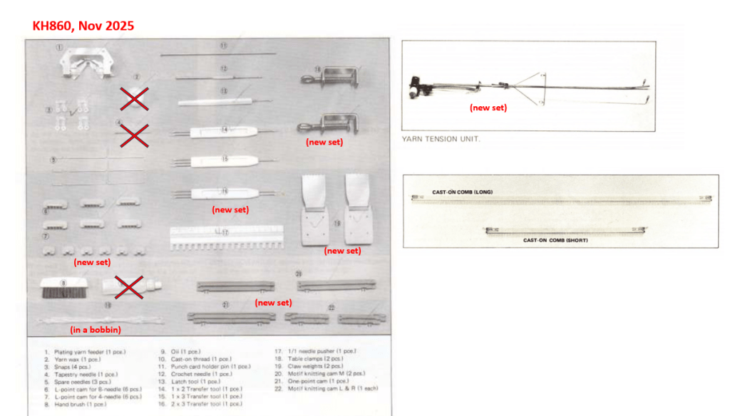 The machine will come with all accessories. A lot of these accessories look brand new (from my personal stash), especially the cast-on combs and the barrel weights. Several are indeed new from new stock (double eyelet transfer needle, needle selection comb, ratchet tool, claw hanging weights).