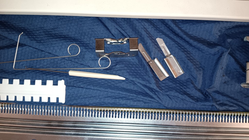 The “screw driver” did not come with this setup either. I am adding a ratchet tool instead. I used it for all adjustments of the ribber. For some adjustments, a regular flat-head screwdriver might be needed.