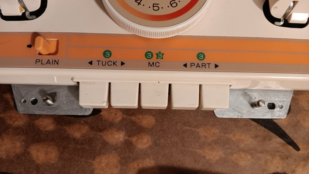 New tension mast (new stock). A tension mast that came with this machine did not include a slot for the wax and a slot for the garter carriage sensor. The only “original” accessory is probably the carriage lock.