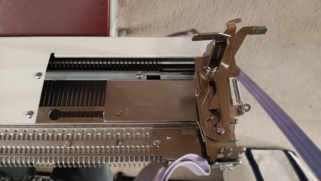 I performed the usual cleaning routine: took out all needles, cleaned and inspected each, replaced bent or those with sticky latches; cleaned and serviced the needlebed. I spent a lot of time making sure that the distance between the main and ribber beds is optimum for my knitting. I used very thin and medium-thin yarns. If you use slightly thicker yarns or thinner ones, you might need to adjust the distance. There are a lot of online resources on how to do it.