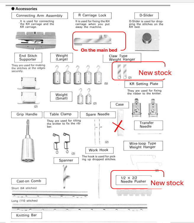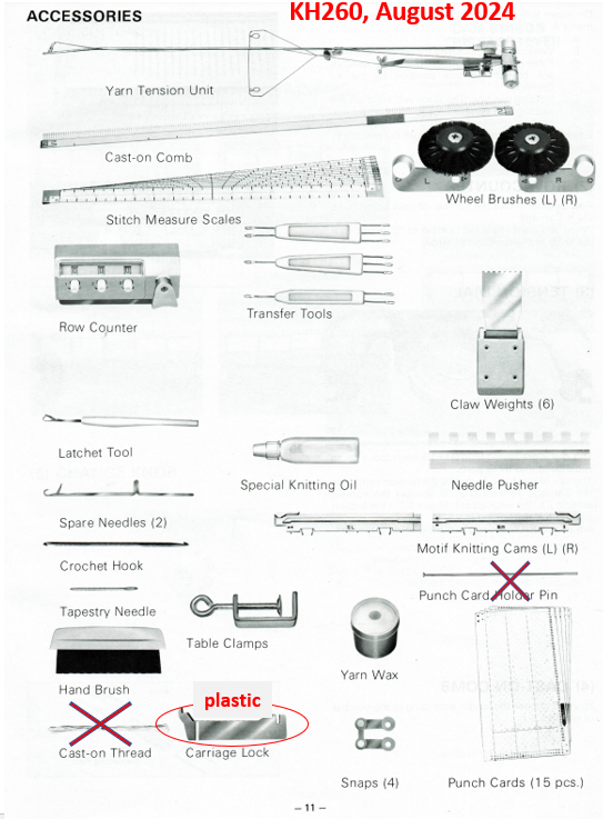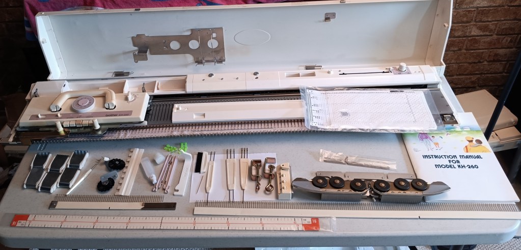 The machine comes with all major assesories, a hard copy of the manual, and three brochures on how to knit various things (all in excellent, barely-use, like-new shape).
