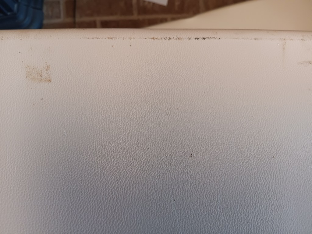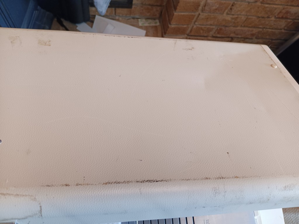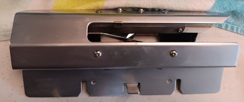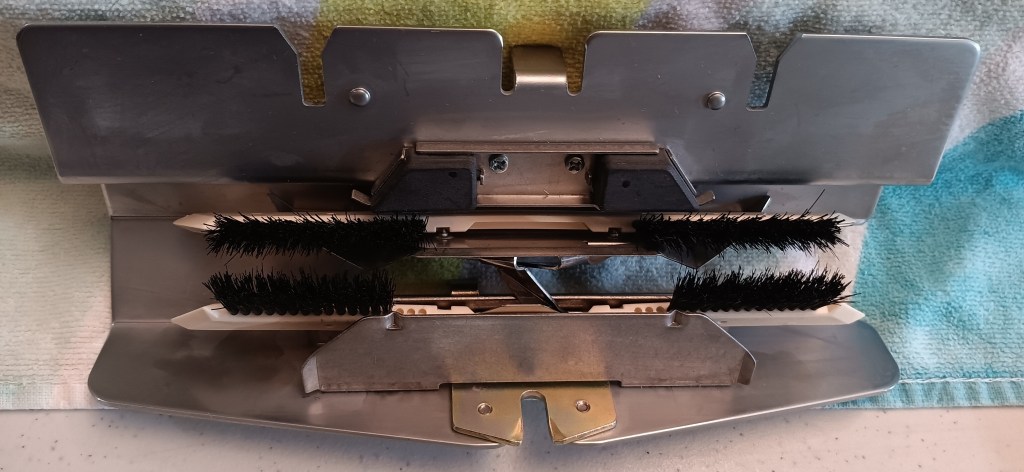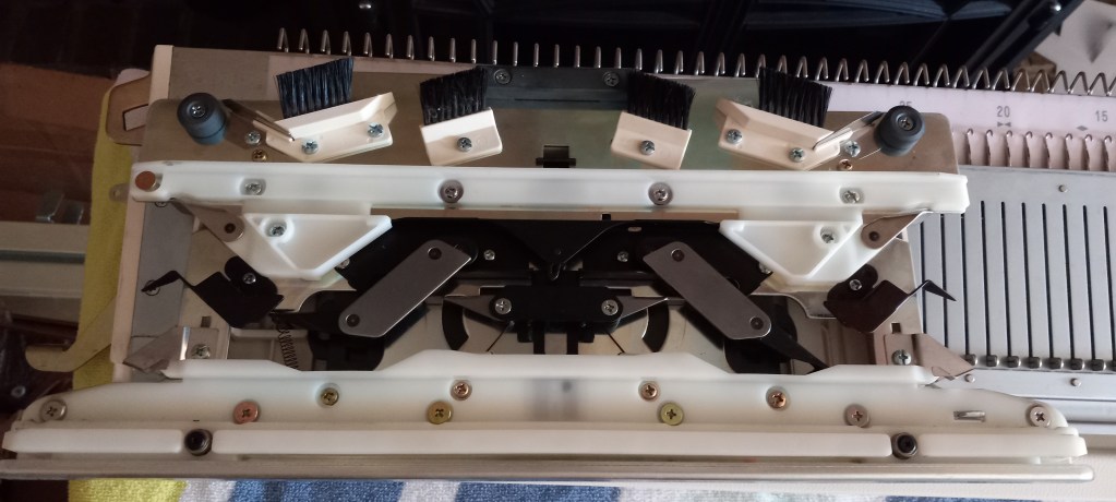When I just took the machine out of the box (which looked like it was the original box), it looked like it was never used. However, it was dusty. I took out all the needles and cleaned and inspected each individually. I removed the sponge bar, cleaned the “canal” for it inside the machine (right under the flatbed), and inserted a new sponge bar. (Video on how to remove a retaining for inspection, or for a needle change bar is here.