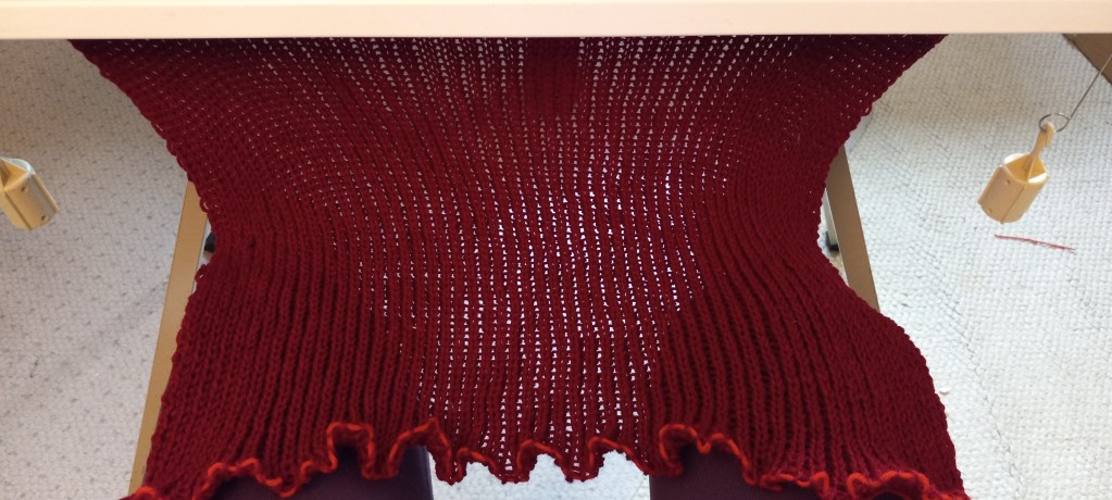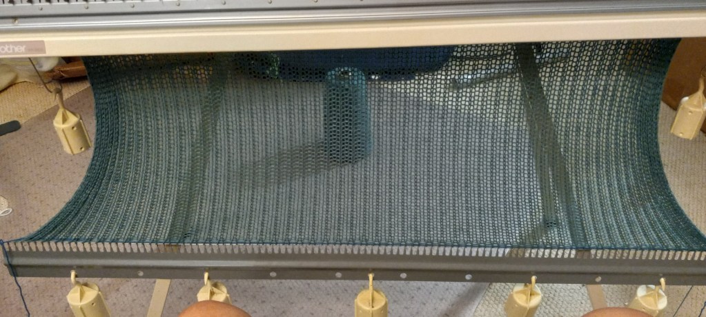 Another interesting observation I made with this model is that it handles knots without too much drama ๐ Here is what I mean by that: during one of my tests, my worsted wool blend tangled a bit and formed a small loose knot. It passed through the carriage so easily that I only saw the knitted-in knot after 10 (or so) rows. On one side, I was pleased because in my other machines, a knot in the yarn means a tighter row, breakage, sudden stopโฆ But in this case, the knot became part of the knitted fabric. In fact, the knitted-in know was visible only on the wrong side but not on the right side.