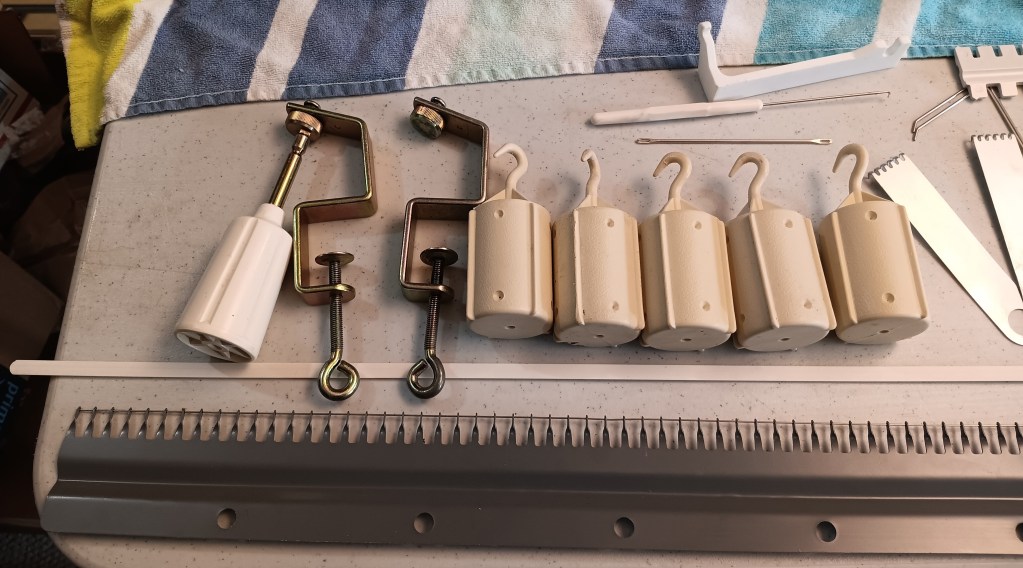 Singer HK100 is considered a mid-gauge/bulky knitting machine. It contains 120 needles and is capable of only manual stitch and needle manipulation to create various patterns, like, tuck, slip, fair isle, cables, lace, etc. However, there are so many youtube tutorials and printed patterns that the possibilities are endless.