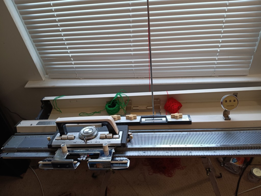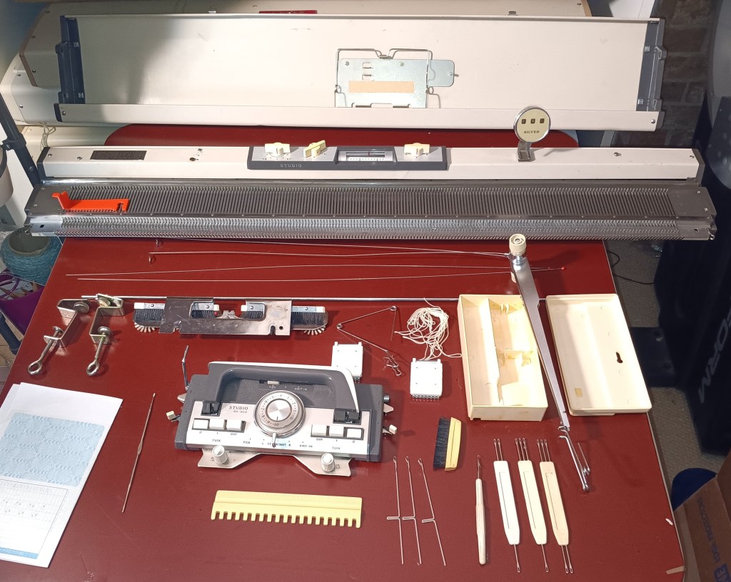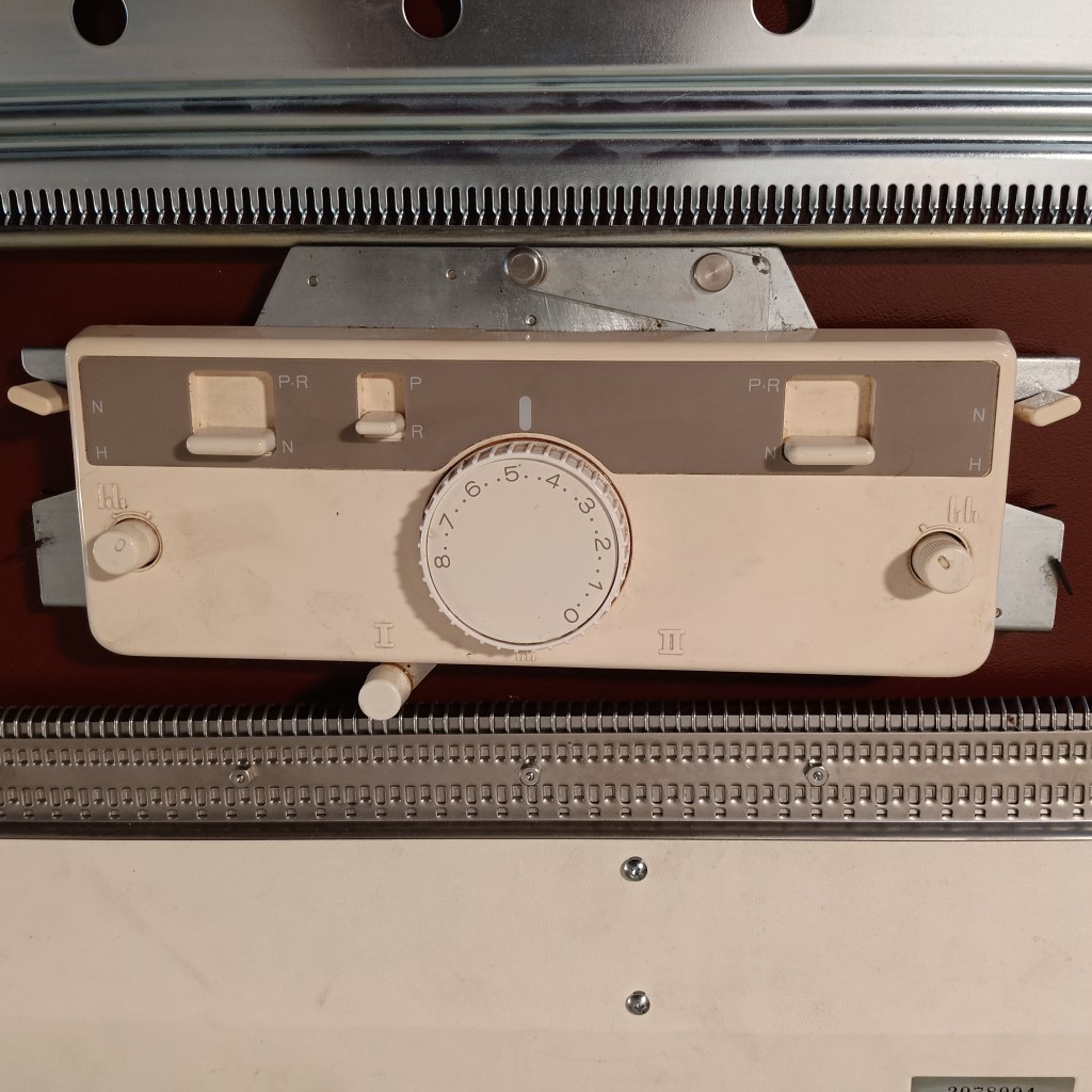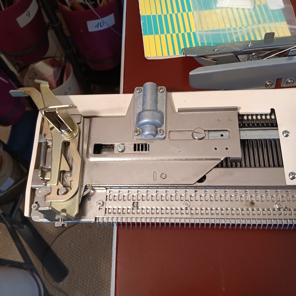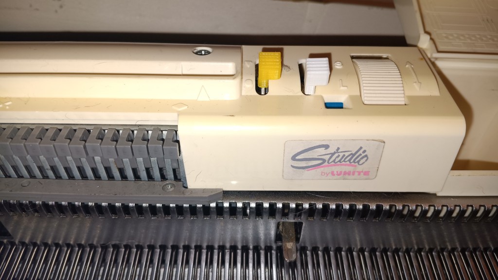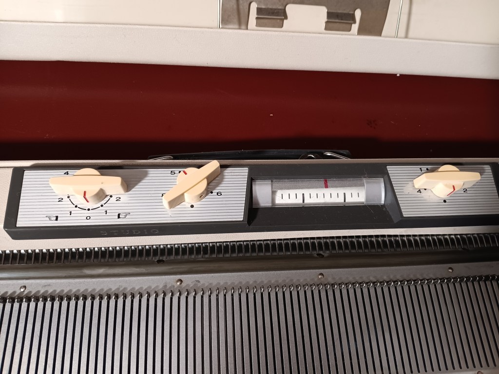 Studo by White SK740 knitting machine is a standard-gauge knitting machine manufactured by the Silver Reed company under the Studio brand name. The machine has 200 needles, 4.5 mm apart, which makes it a standard-gauge knitting machine. Read more about this model in my Knitting Machine Encyclopedia. Also, read the general details and pros and cons of a similar machine, Singer mod. 740. The post below is dedicated to a specific Studio by White SK740 knitting machine, refurbished, served, and tested in my shop.