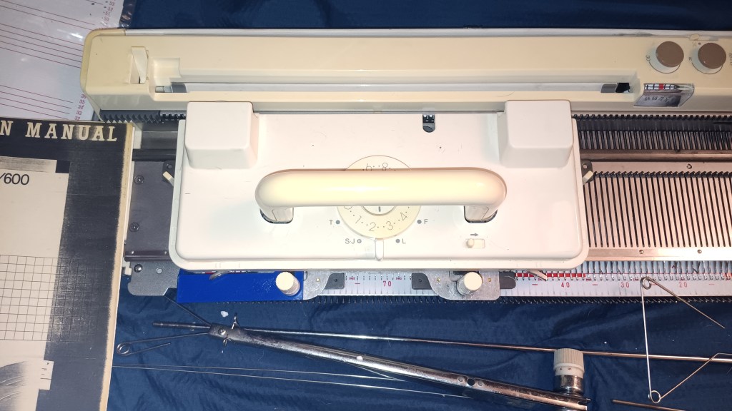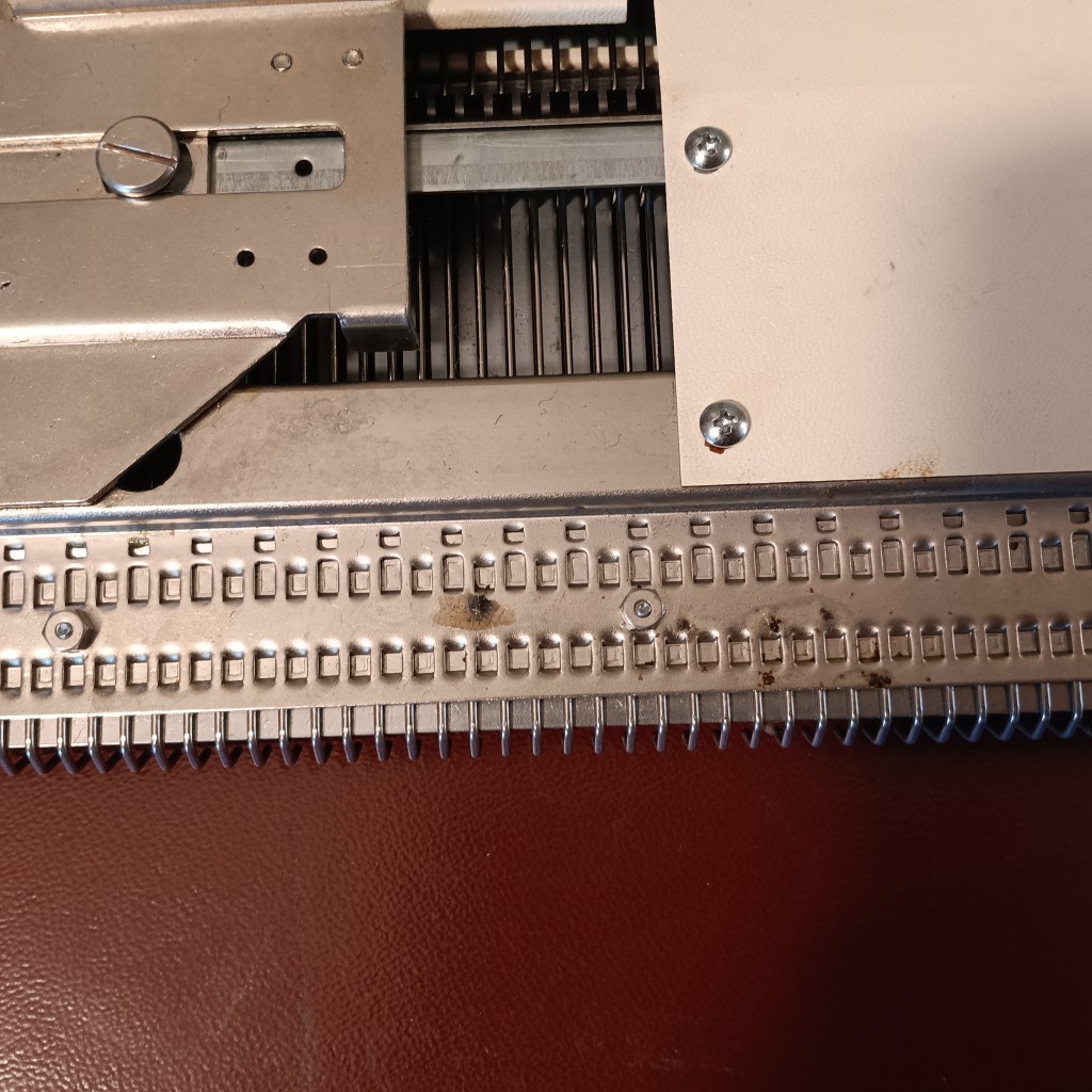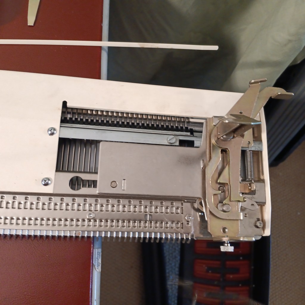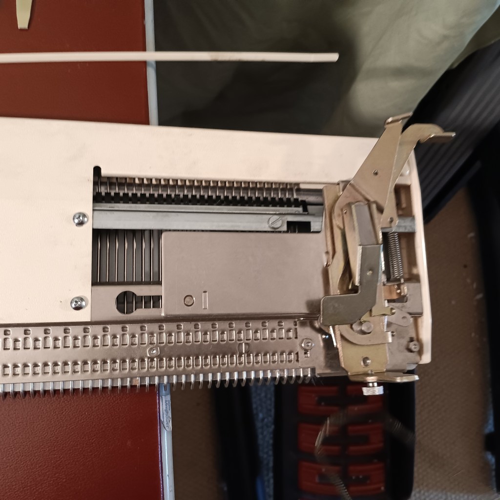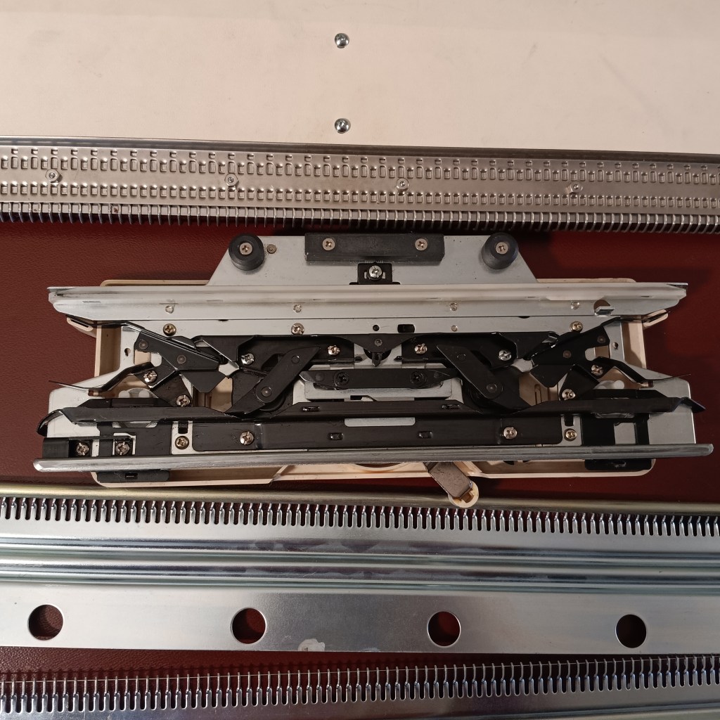 Studo by White SK740 knitting machine is a standard-gauge knitting machine manufactured by the Silver Reed company under the Studio brand name. The machine has 200 needles, 4.5 mm apart, which makes it a standard-gauge knitting machine. Read more about this model in my Knitting Machine Encyclopedia. Also, read the general details and pros and cons of a similar machine, Singer mod. 740. The post below is dedicated to a specific Studio by White SK740 knitting machine, refurbished, served, and tested in my shop.
