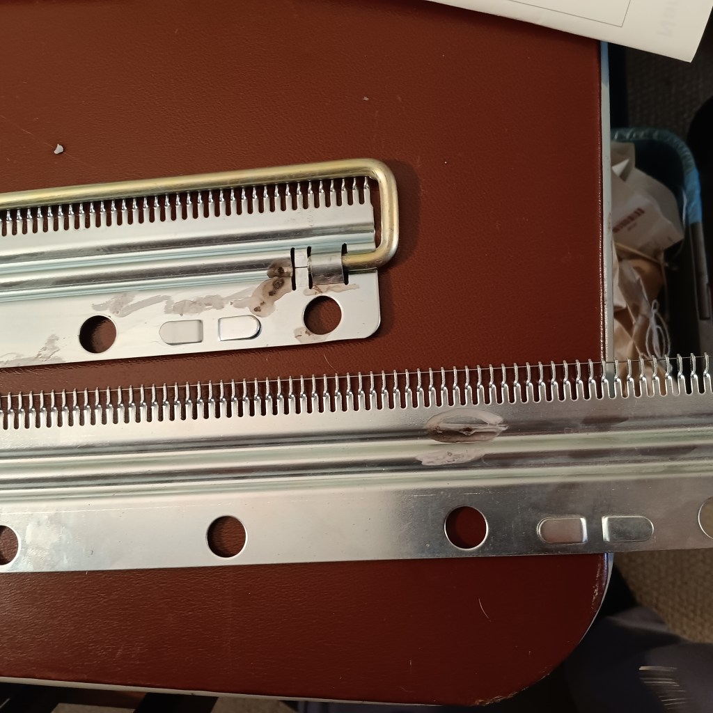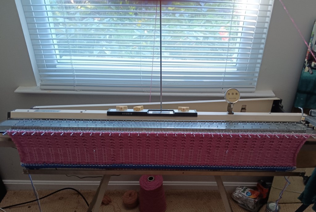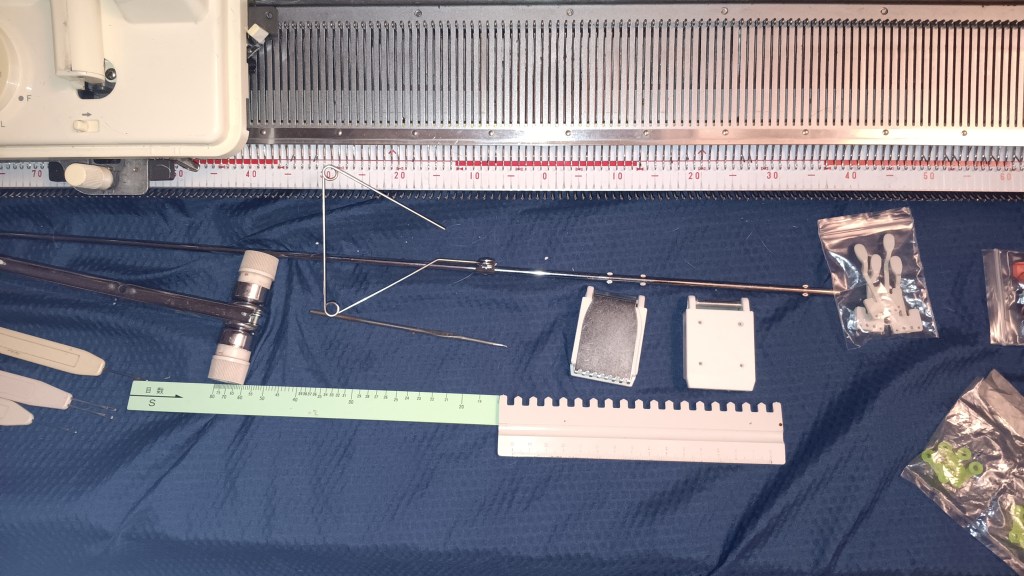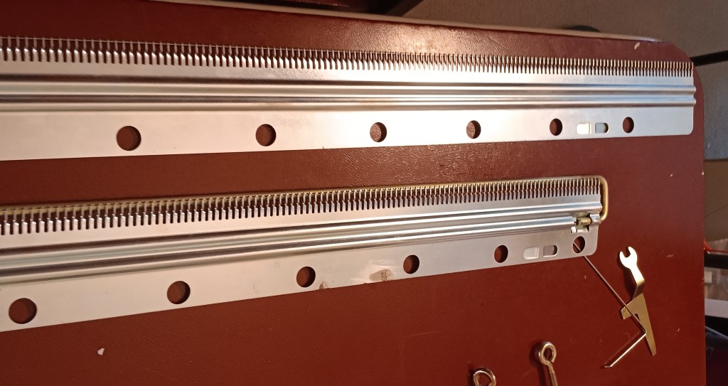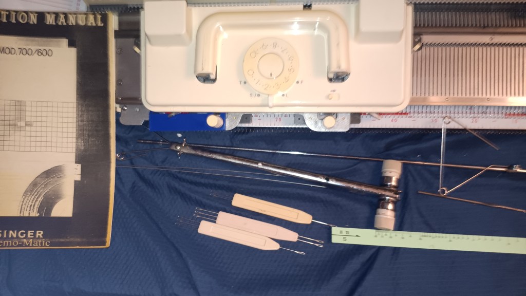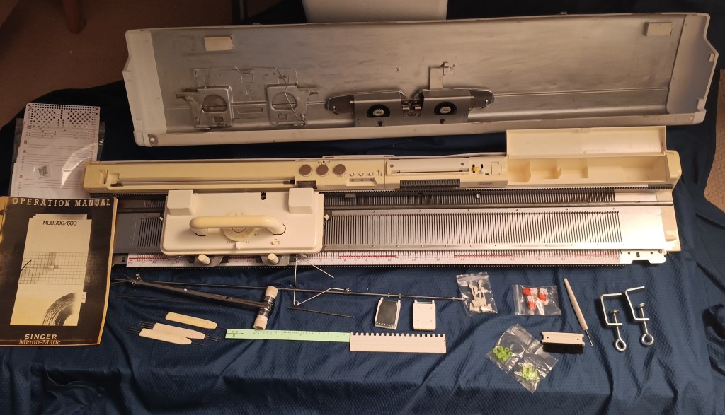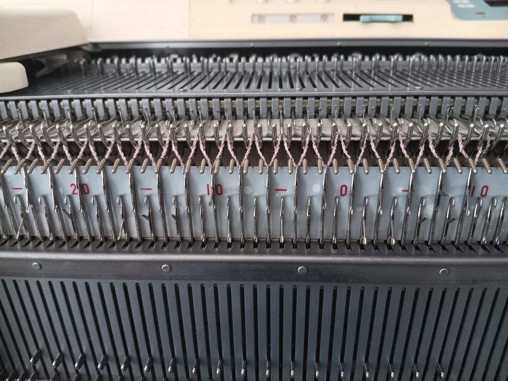 Studo by White SK740 knitting machine is a standard-gauge knitting machine manufactured by the Silver Reed company under the Studio brand name. The machine has 200 needles, 4.5 mm apart, which makes it a standard-gauge knitting machine. Read more about this model in my Knitting Machine Encyclopedia. Also, read the general details and pros and cons of a similar machine, Singer mod. 740. The post below is dedicated to a specific Studio by White SK740 knitting machine, refurbished, served, and tested in my shop.