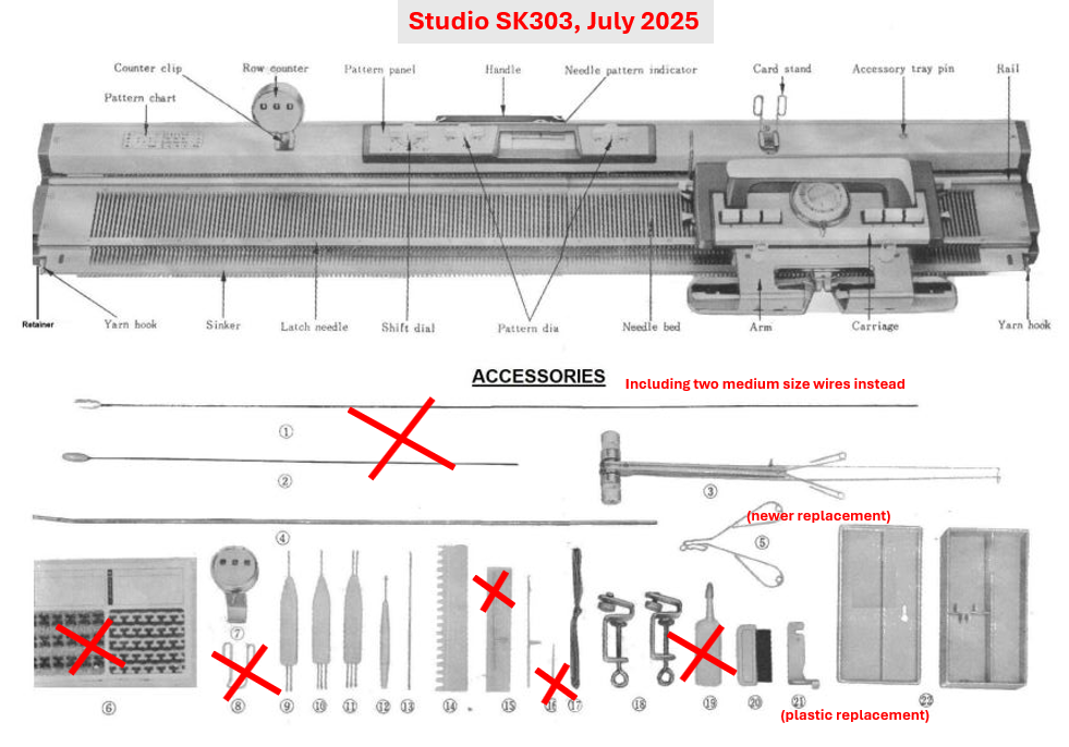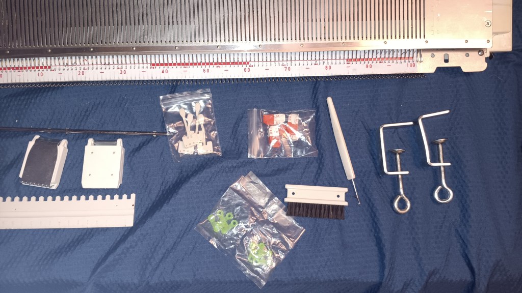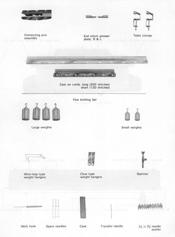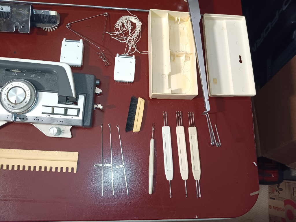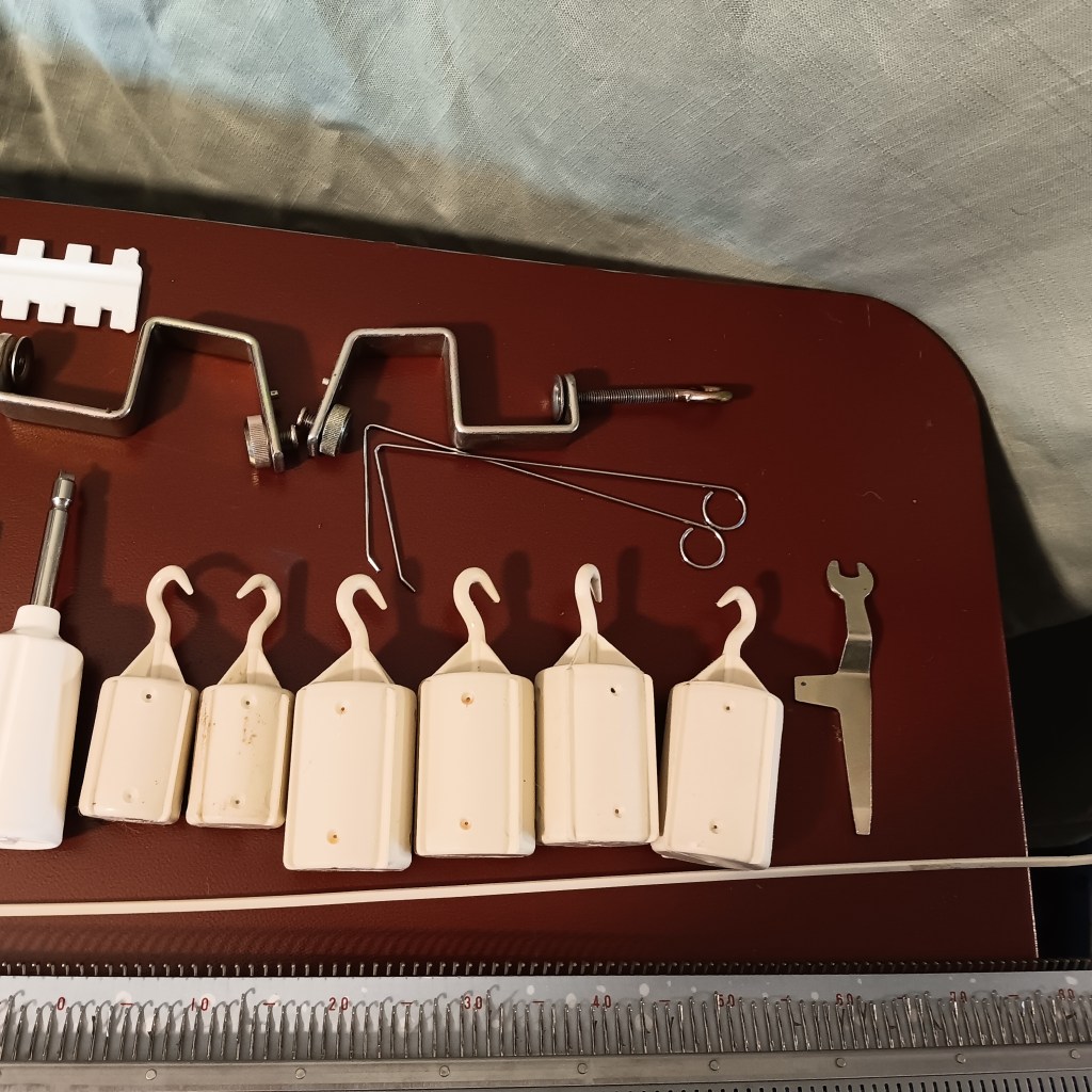 Some of the accessories will not be included and this is why the price is lower than other machines of the same type sold in my shop. Also none of the missing accessories and imperfections prevented me from knitting and making beautiful things on this machine.