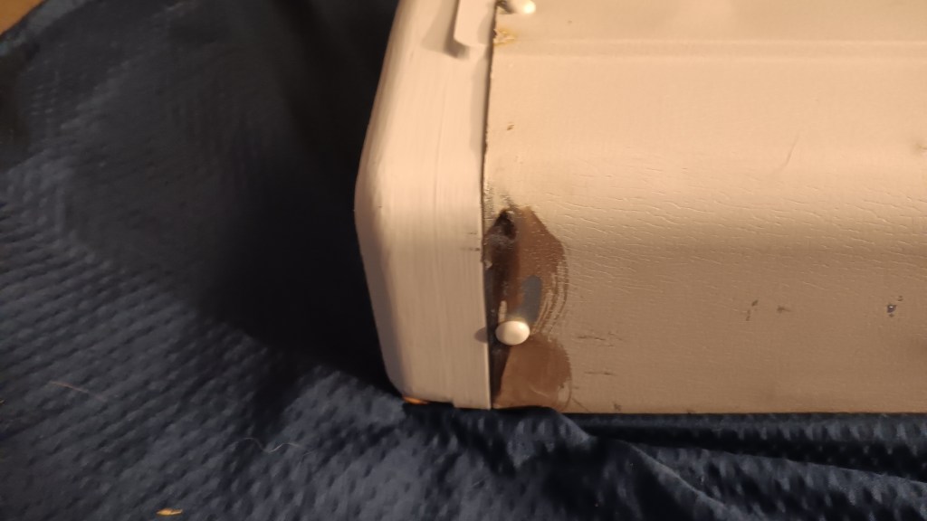 End caps on the main bed have discoloration. End caps on the lid are new (I specially 3D printed them out of a very durable material because they were cracked). The plastic rivets are also brand new.