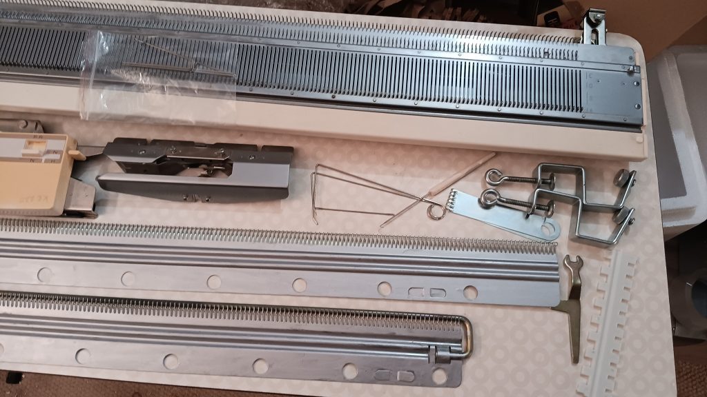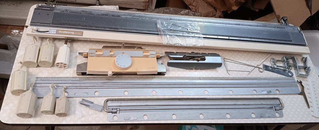 The machine will come with all accessories but one: the fine bar. The one that came with the machine is in rough, unusable shape and I don’t have a spare one. It is absolutely not the main accessory (a lot of knitters posting on social media that they don’t even use it).