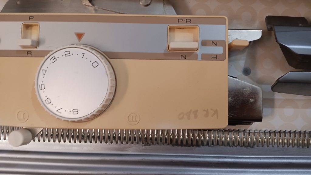 KnitKing KR880 ribbing attachment fits standard-gauge Brother, Defendi and KnitKing punchcard and electronic knitting machines. It is identical to Brother KR830 ribber. Read more about KnitKing KR880 and Brother KR830 ribbers in my Knitting Machine Encyclopedia. The rest of the post below is dedicated to a specific ribber serviced and tested in my shop in March 2026.