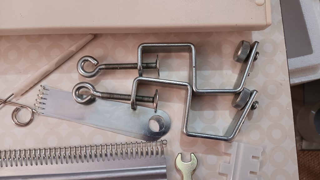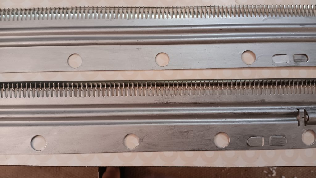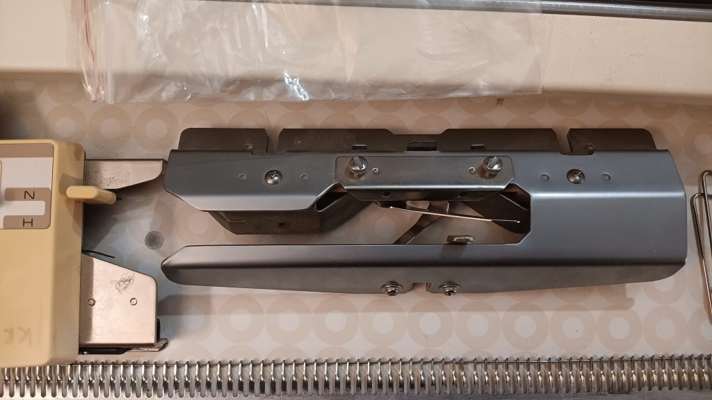 The carriage of the KnitKing KR880 ribber was cleaned and serviced. All buttons and levers move freely and function properly. All needles were removed, cleaned, and inspected. The connecting brackets are new (read more on that below).