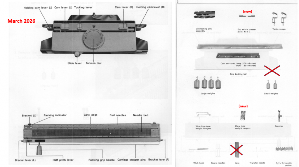 The connecting arm is not the original one to KR880 but a replacement from the Brother KR850 ribber. That connecting arm is a bit more “advanced” since a plating attachment can be added if desired. I do not have one at the moment to spare, otherwise I would have included it. The hard copy of the manual will not be included as well, but its free pdf copy is available online for free.