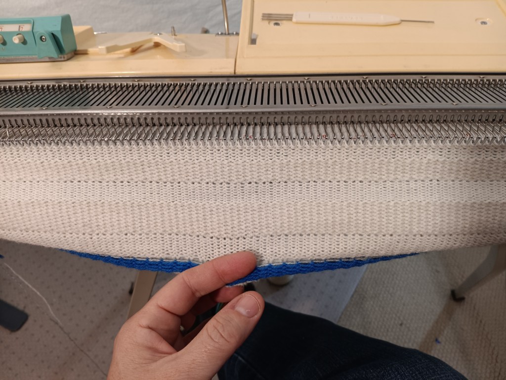I knitted several swatches (tuck, slip, stockinet and fair isle) on this machine to ensure the carriage functions properly. I also knitted on the full bed to ensure all needles form proper stitches and that the patterning mechanism works well on the whole needlebed. Watch the video of all tests. The picture below shows the tuck-stitch fabric knitted during these tests.