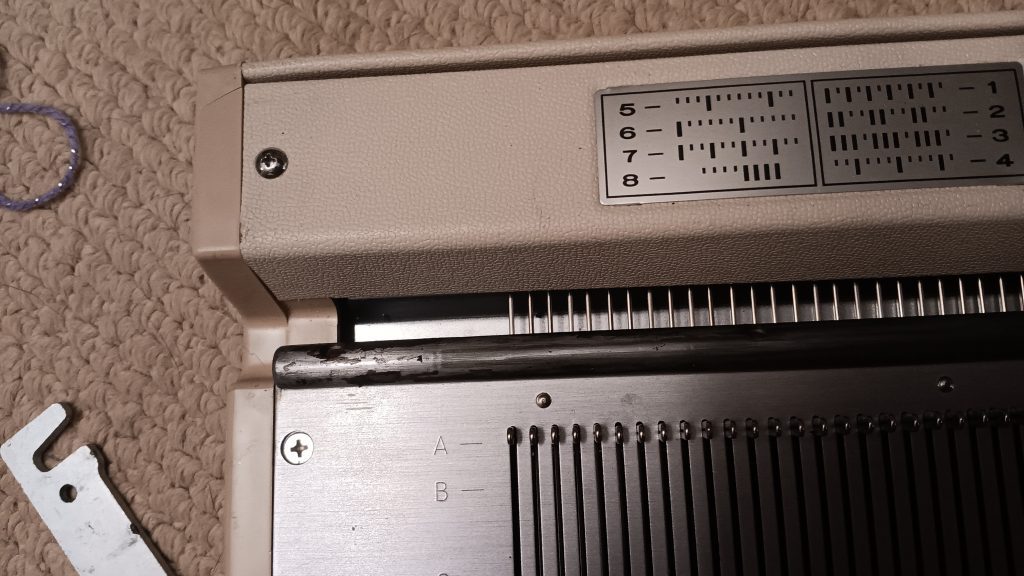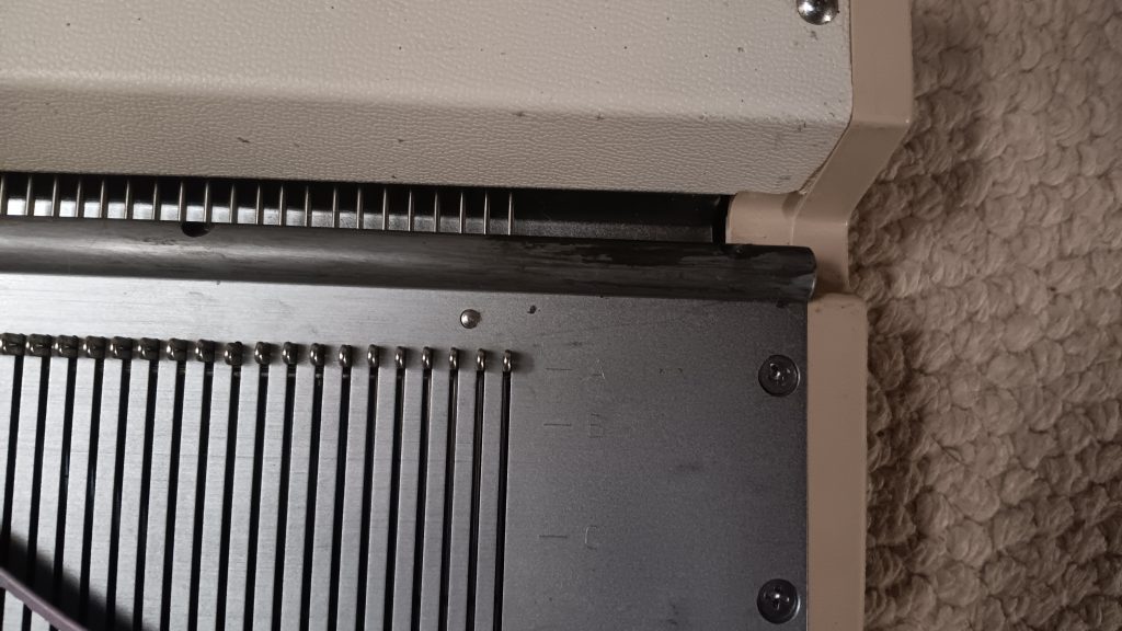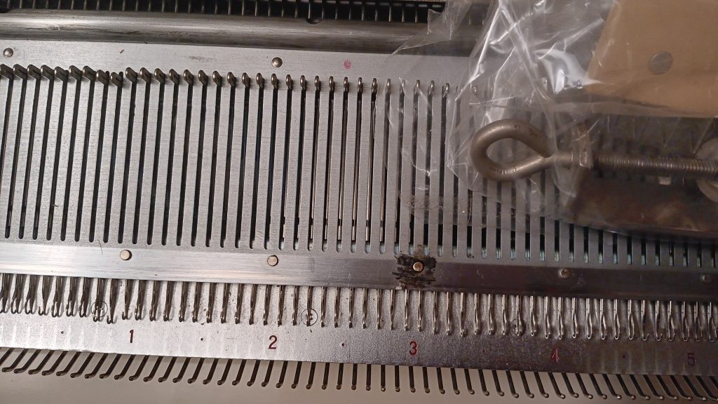 The machine was cleaned, including the deep clean of the carriage and the punchcard reader. All needles were removed, cleaned, and individually inspected. So, about 75% of the needles are the original ones, and 25% are new. After all the knitting tests, I check the needles again: first visually and if they look suspicious (out of alignment, for example), I remove them and check against new needles. The needles that were even a bit suspicious were replaced with new ones.